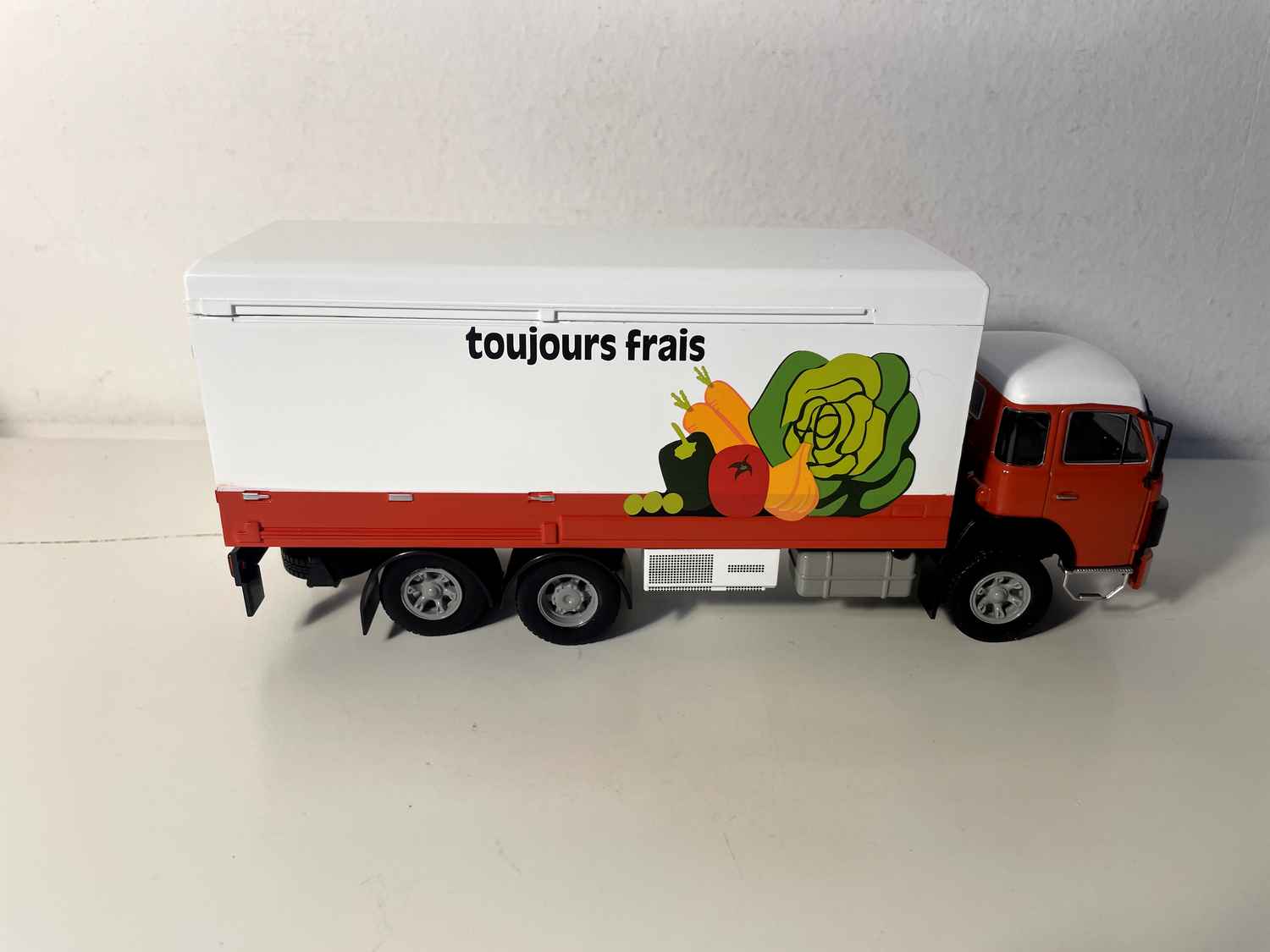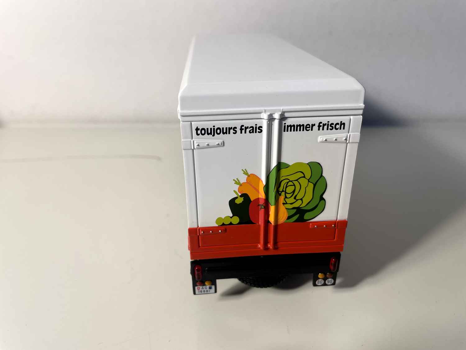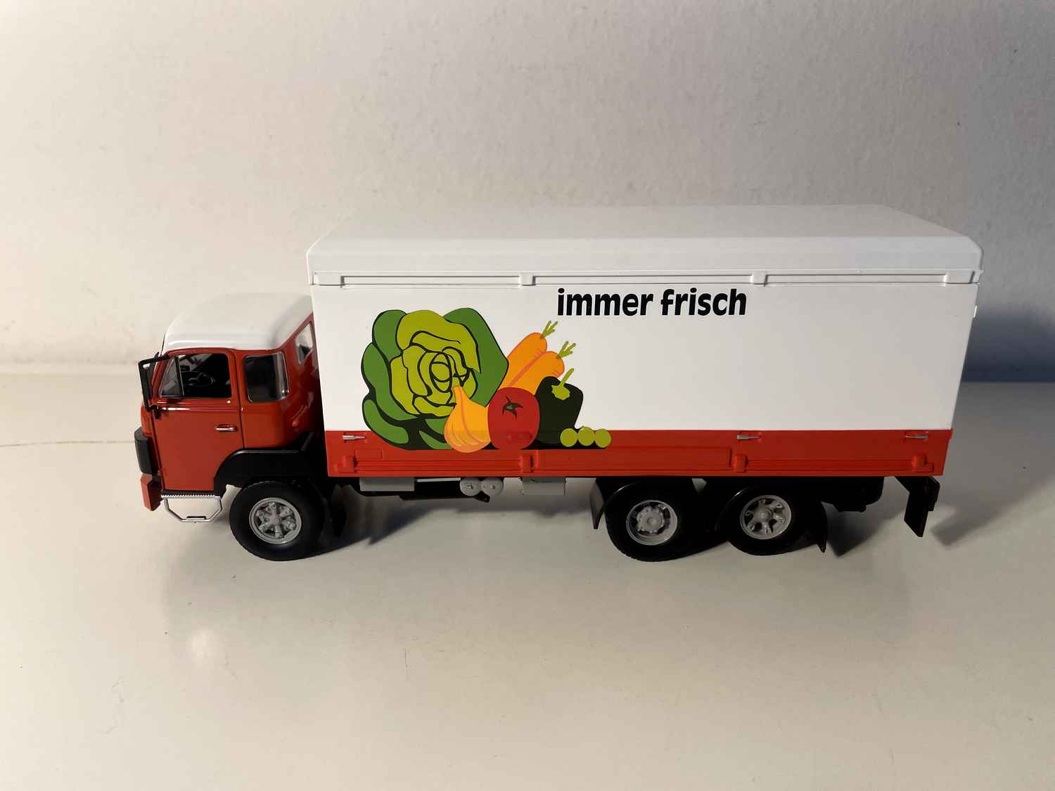 Diese Miniatur richtet sich an Sammler, die sich für die Welt historischer Schwerlastfahrzeuge begeistern, und stellt ein wertvolles Zeugnis der technologischen Entwicklung im Kühltransportsektor dar. Die Lackierung „Immer Frisch“ erinnert an das Qualitätsbewusstsein der Genossenschaft COOP.