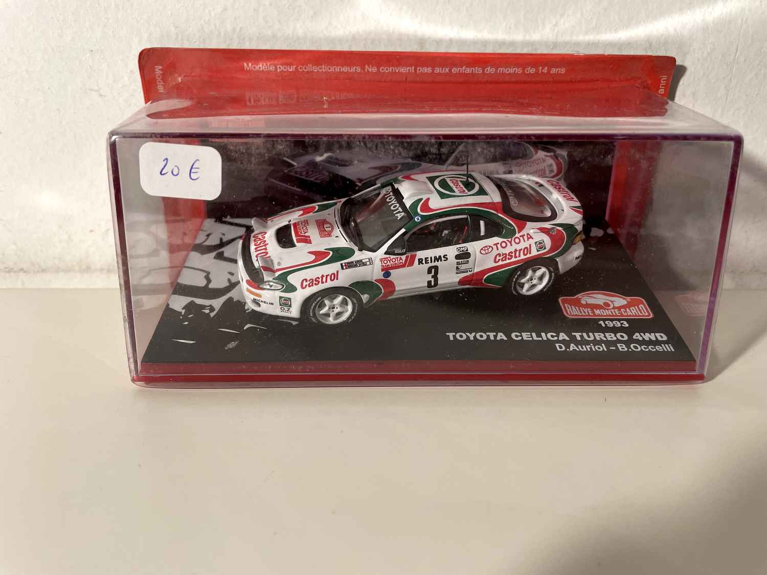 Entdecken Sie dieses prächtige Modell der Toyota Celica Turbo 4WD, das Geschichte beim Monte-Carlo-Rallye 1993 schrieb. Diese 1/43 Maßstab Miniatur reproduziert das Fahrzeug, das von dem französischen Duo Didier Auriol und Bernard Occelli gefahren wurde, und präsentiert die markante dreifarbige Lackierung Nummer 3.