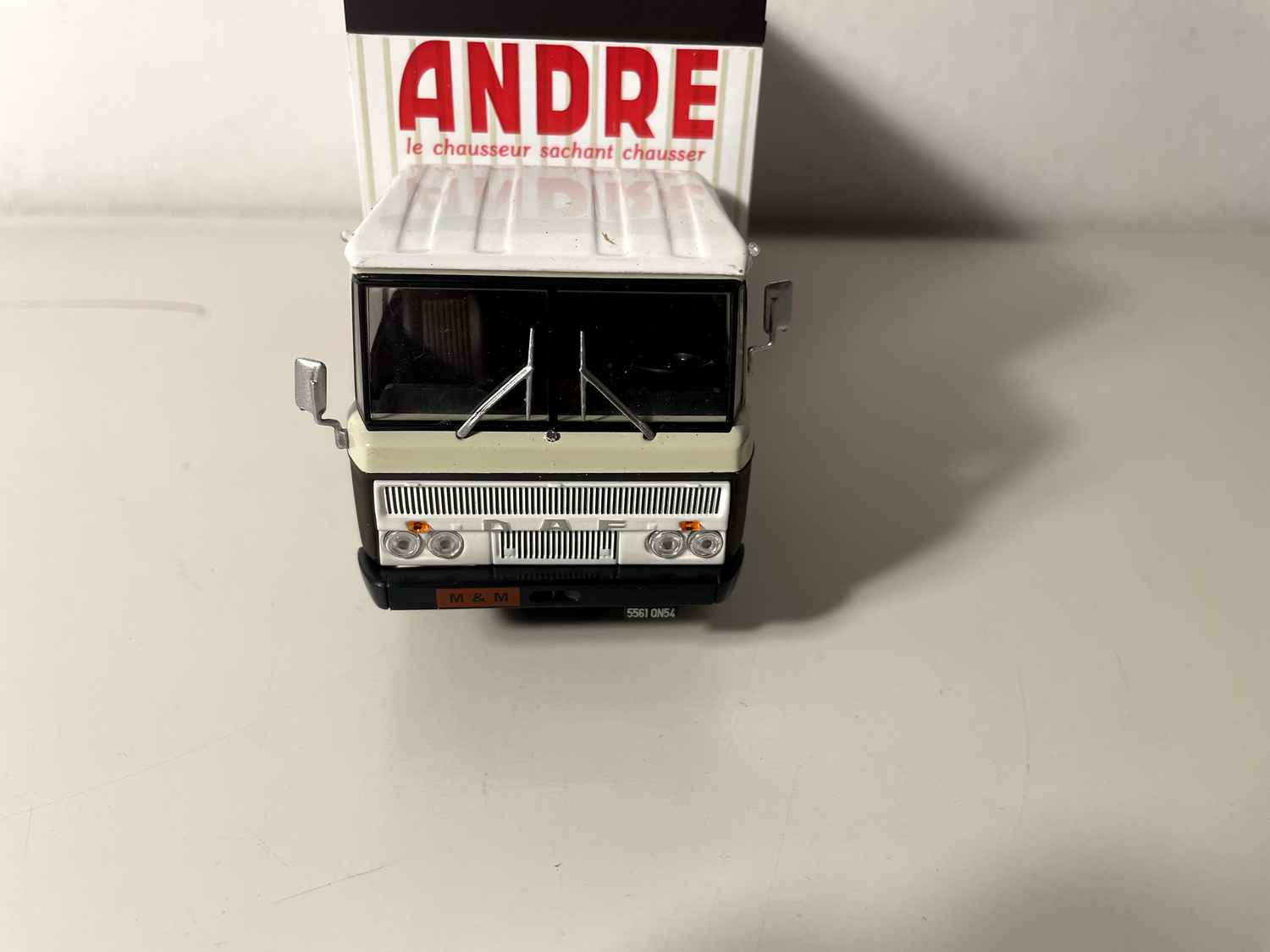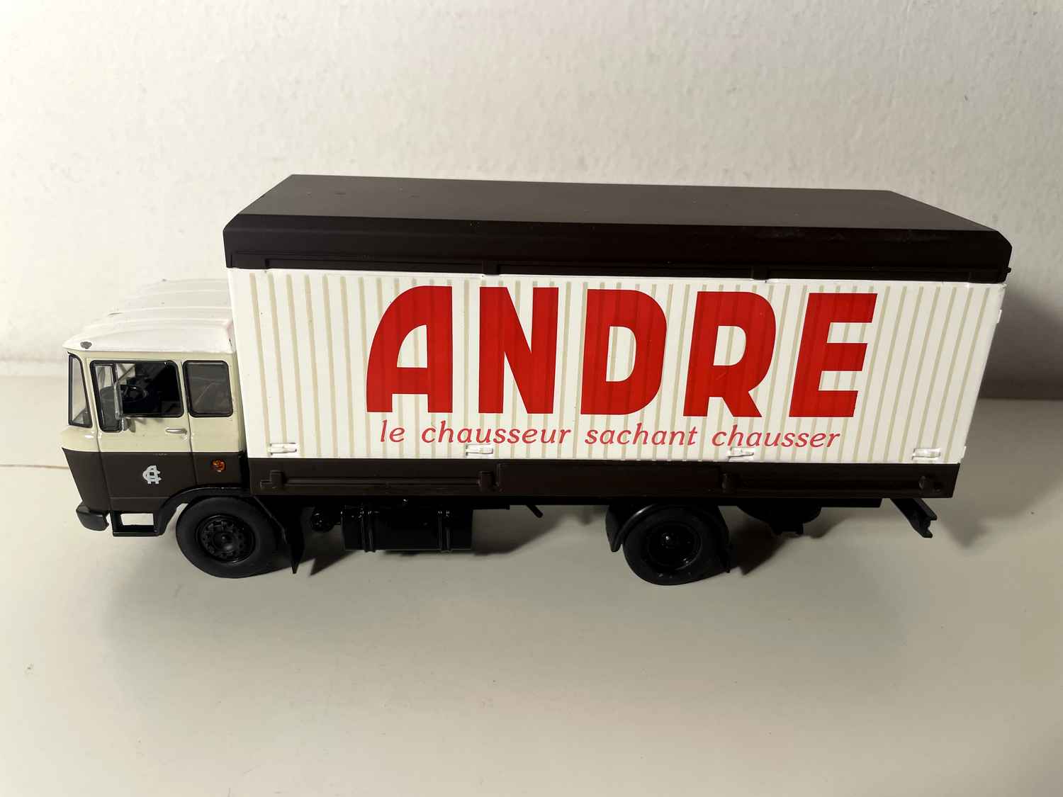 The ANDRE brand, whose livery adorns this DAF A2600, embodies one of the greatest success stories in the French shoe industry. Founded in 1904 by Auguste André in Château-Gontier, this family business experienced spectacular growth in the 1960s and 1970s, a period that corresponds exactly to that of our model car.