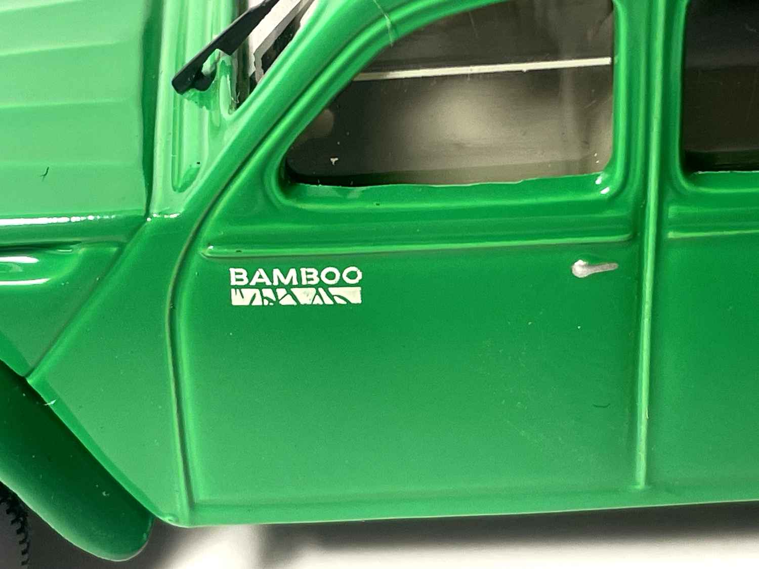 The Citroën 2CV 6 BAMBOO represents one of the last evolutions of the famous 2CV, launched in the 1970s. This version was distinguished by its original two-tone colors and special finishes that marked the entry of the "Deudeuche" into a new aesthetic era. The BAMBOO version, with its characteristic green hue, perfectly embodied the nature and freedom spirit of the 70s.