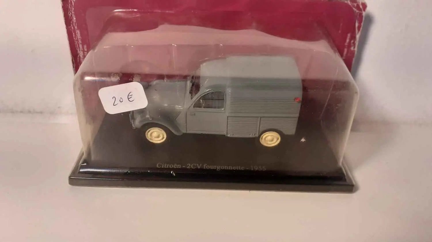 The gray 1955 Citroën 2CV van with pale yellow rims represents one of the most iconic commercial vehicles in French motoring. This model car faithfully captures the authentic spirit of this commercial version of the famous "Deudeuche," perfectly embodying the French ingenuity of the 1950s.