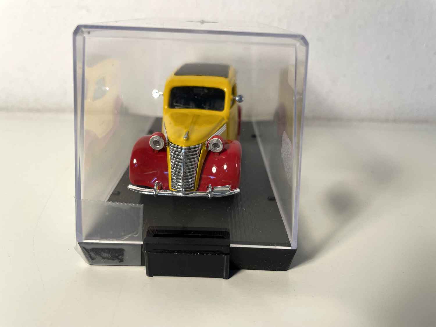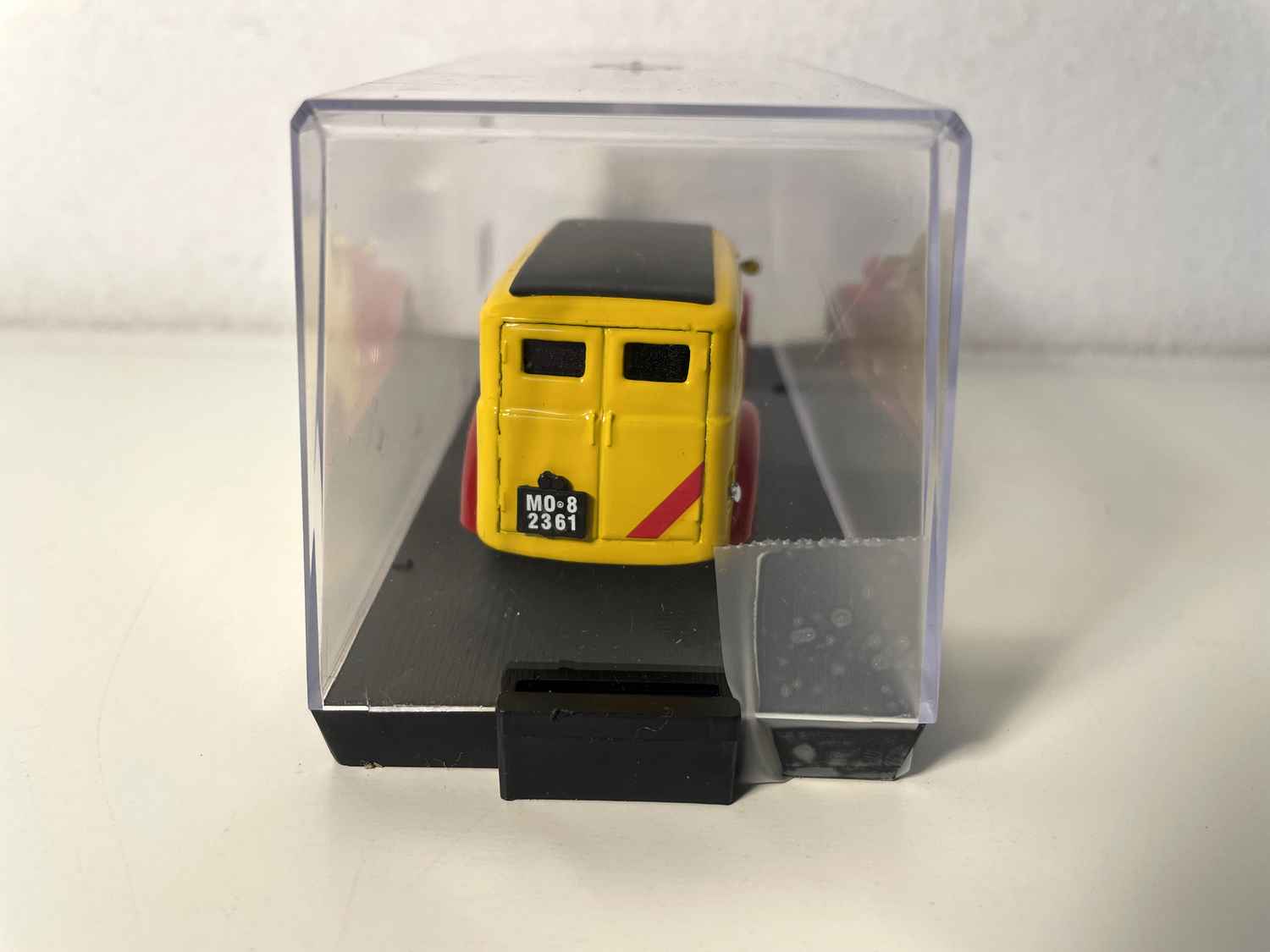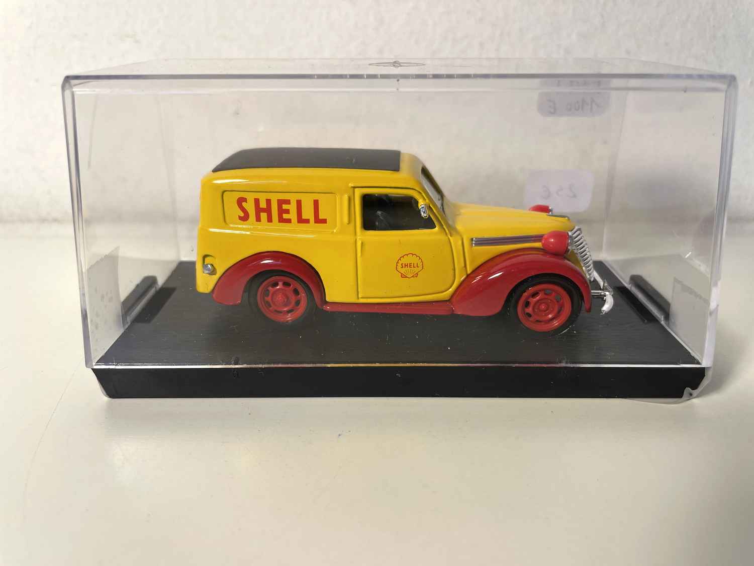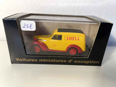 Discover this magnificent model car Fiat 1100 E in the iconic Shell colors, sporting a yellow and red livery that immediately evokes the oil world of the 1950s. This faithful reproduction perfectly captures the spirit of this legendary Italian sedan in its utility version.