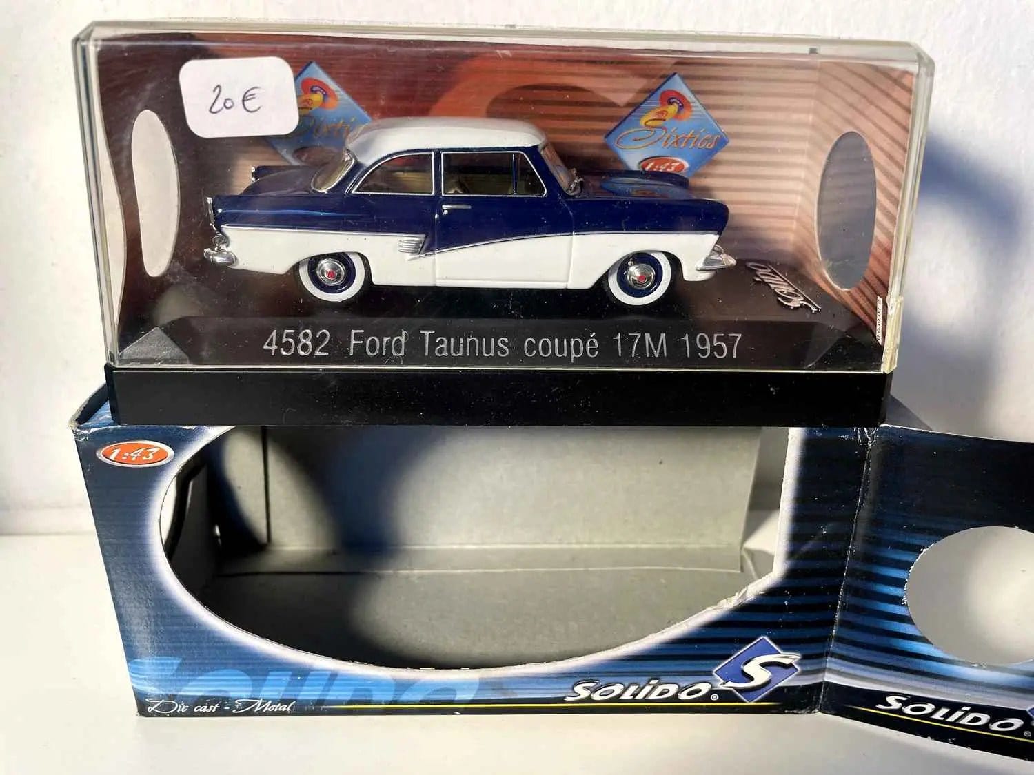 The 1957 Ford Taunus 17M coupé in blue and white livery, reproduced by Solido under reference 4582, perfectly embodies the automotive elegance of the 1950s. This 1:43 scale miniature accurately captures the characteristic lines of this iconic model, which marked a new era for Ford in Europe.