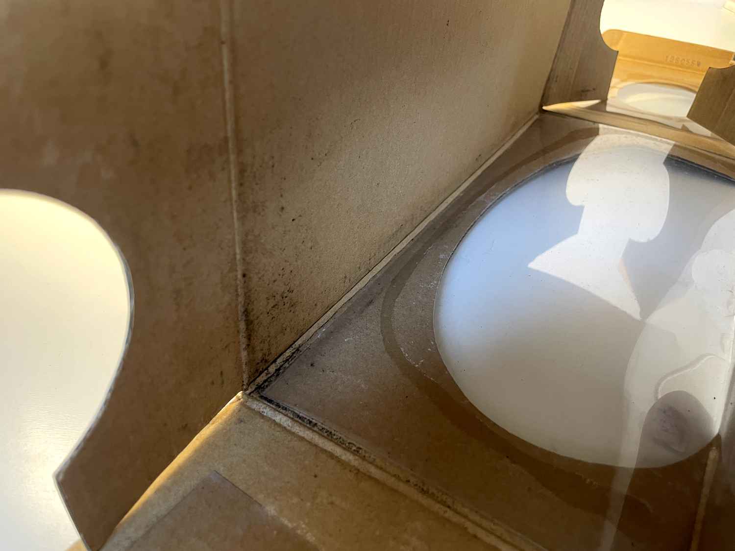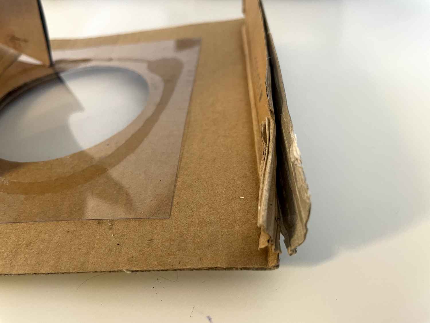 The cardboard box has absorbed moisture, which is causing the cardboard to peel off and there are mold stains (see photos)