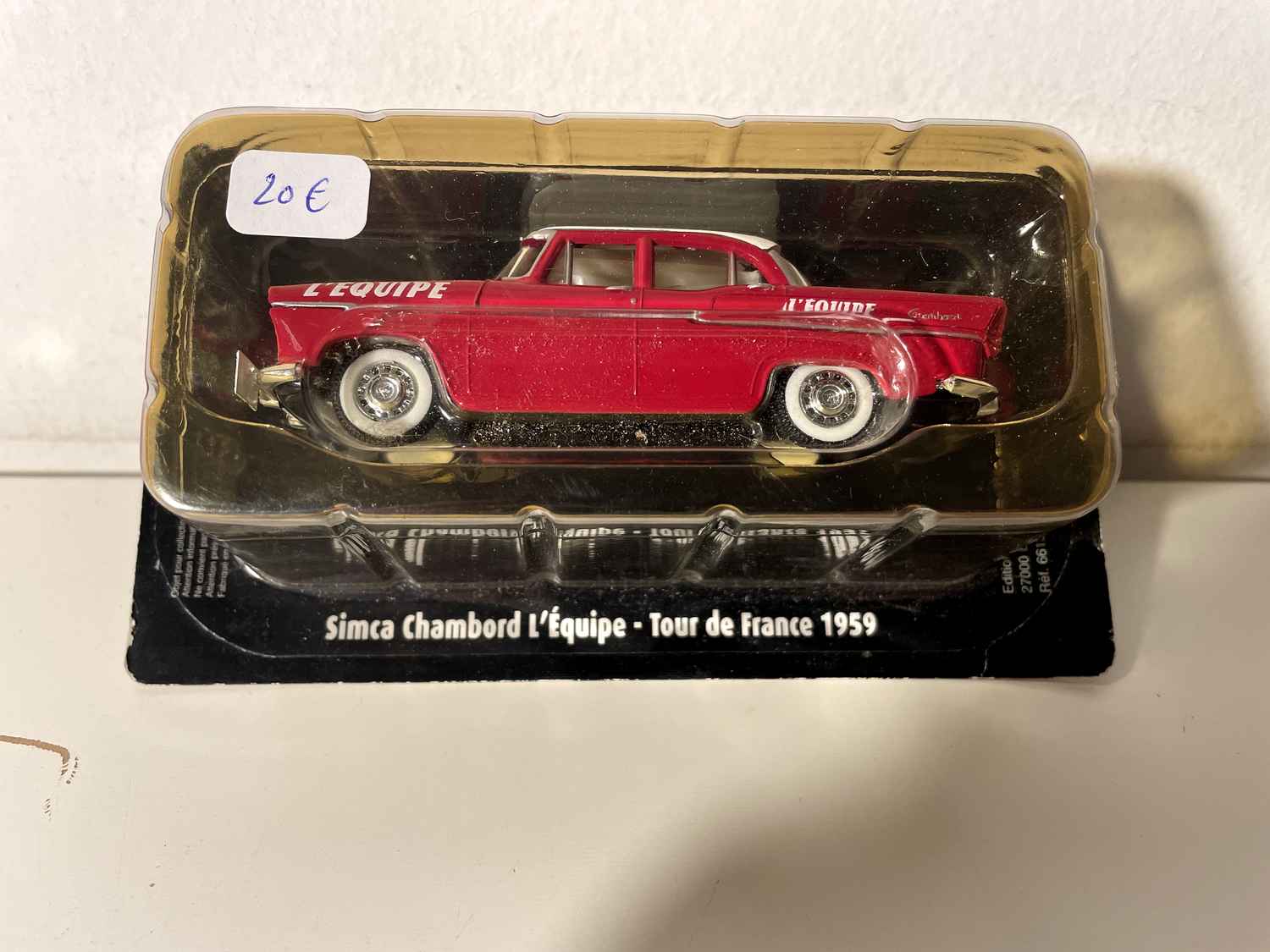 This beautiful miniature Simca Chambord red "L'Équipe" transports us into the exciting world of the 1959 Tour de France, where following cars accompanied the peloton on the roads of France. Faithfully reproducing the official vehicle of the famous sports newspaper, this piece perfectly captures the spirit of this golden era of French cycling.