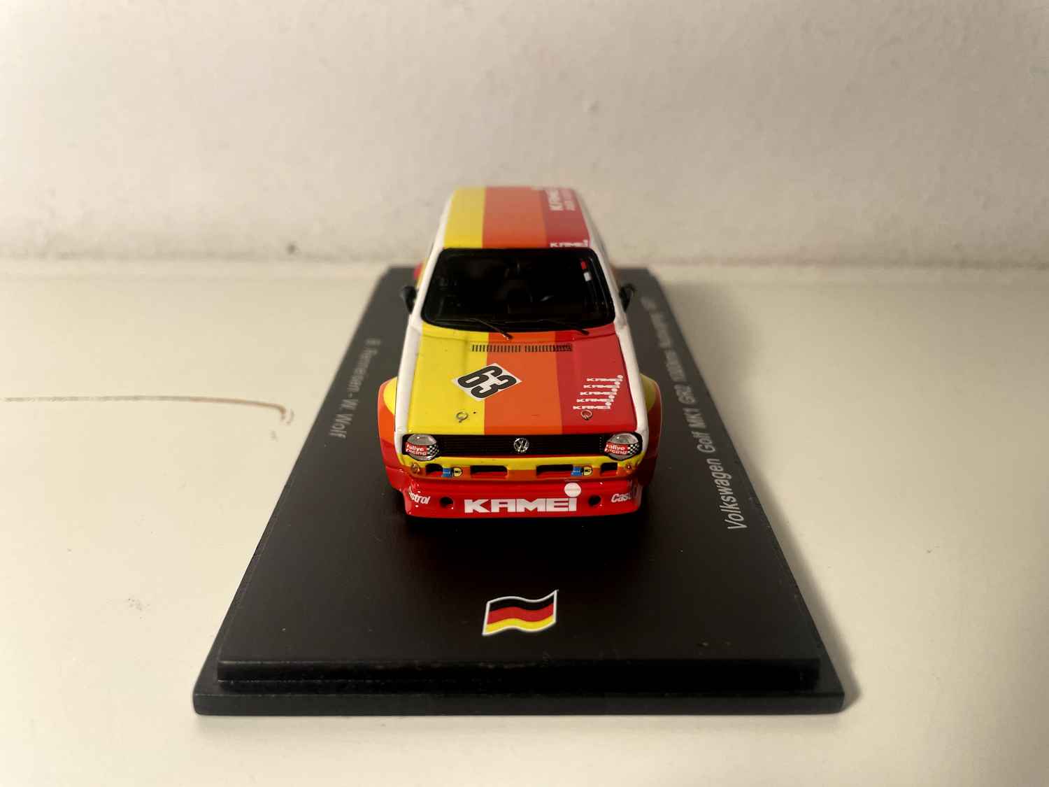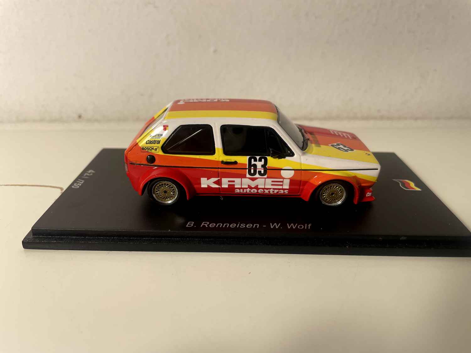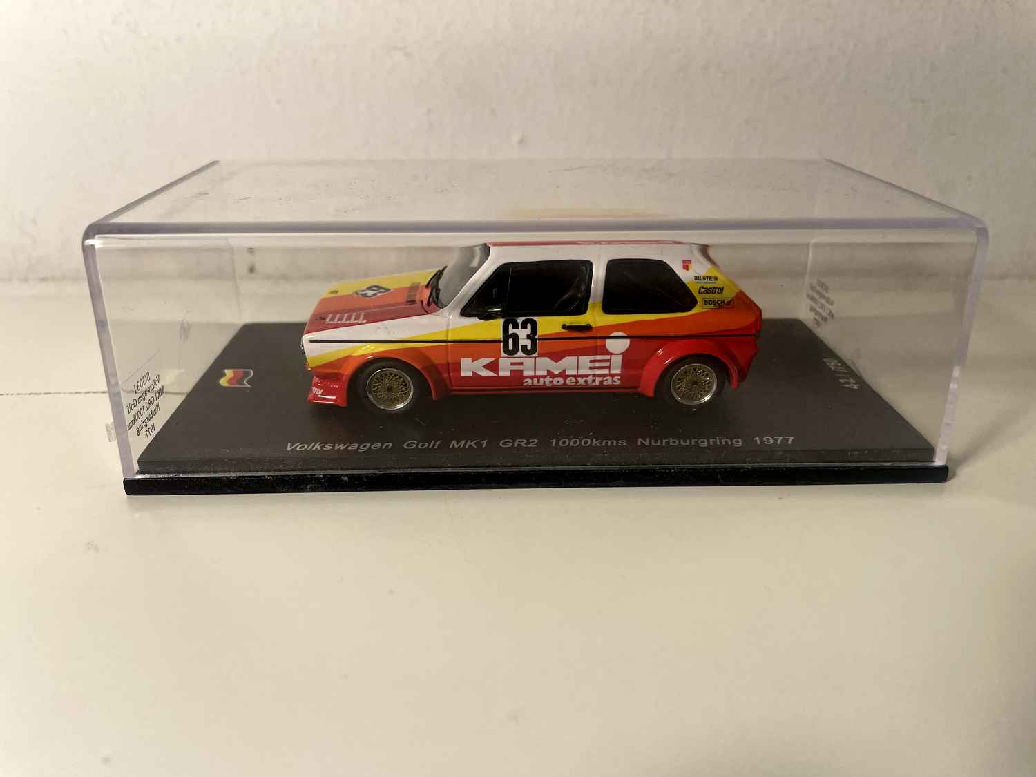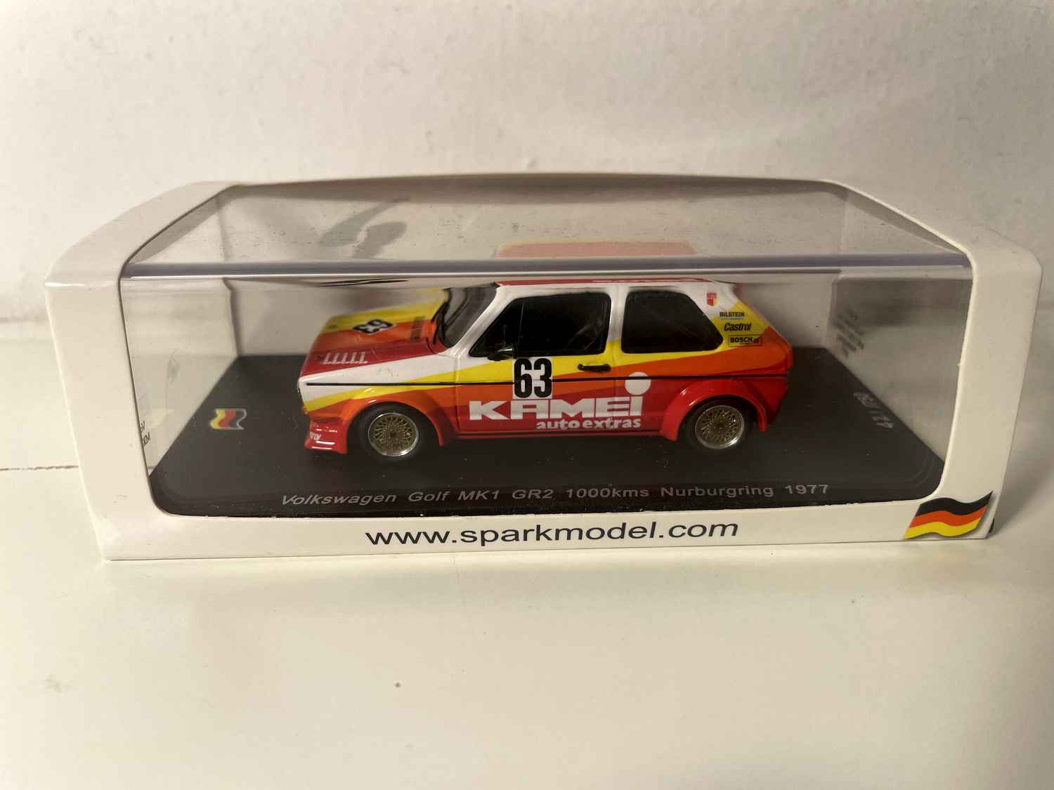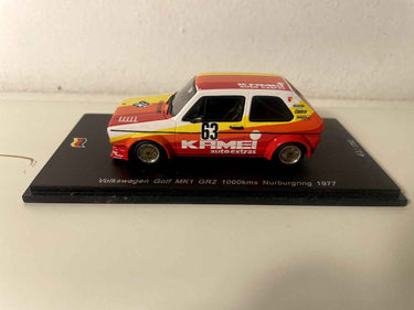 Model Car Volkswagen Golf MKI GR2 yellow, orange and red number 63 - 1000 kms of Nurburgring (Germany) from 1977 - SPARK