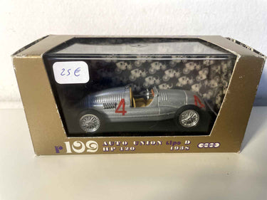 Esta magnífica reproducción del Auto Union Tipo D de 1938 captura toda la potencia y la elegancia de uno de los monoplazas más revolucionarios de la historia del automovilismo. Con su decoración gris y su icónico número 4 , esta miniatura de Brumm encarna a la perfección el espíritu pionero de los Grandes Premios de preguerra.