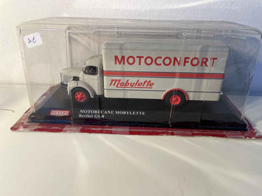 A continuación se muestra una notable reproducción en miniatura del camión Berliet GLR en los colores de Motoconfort, el emblemático transportista de mobylettes de los años 50-60. Esta pieza de colección captura la esencia de una época en la que los vehículos ligeros recorrían las carreteras francesas entregando las revolucionarias dos ruedas motorizadas que transformarían la movilidad popular.