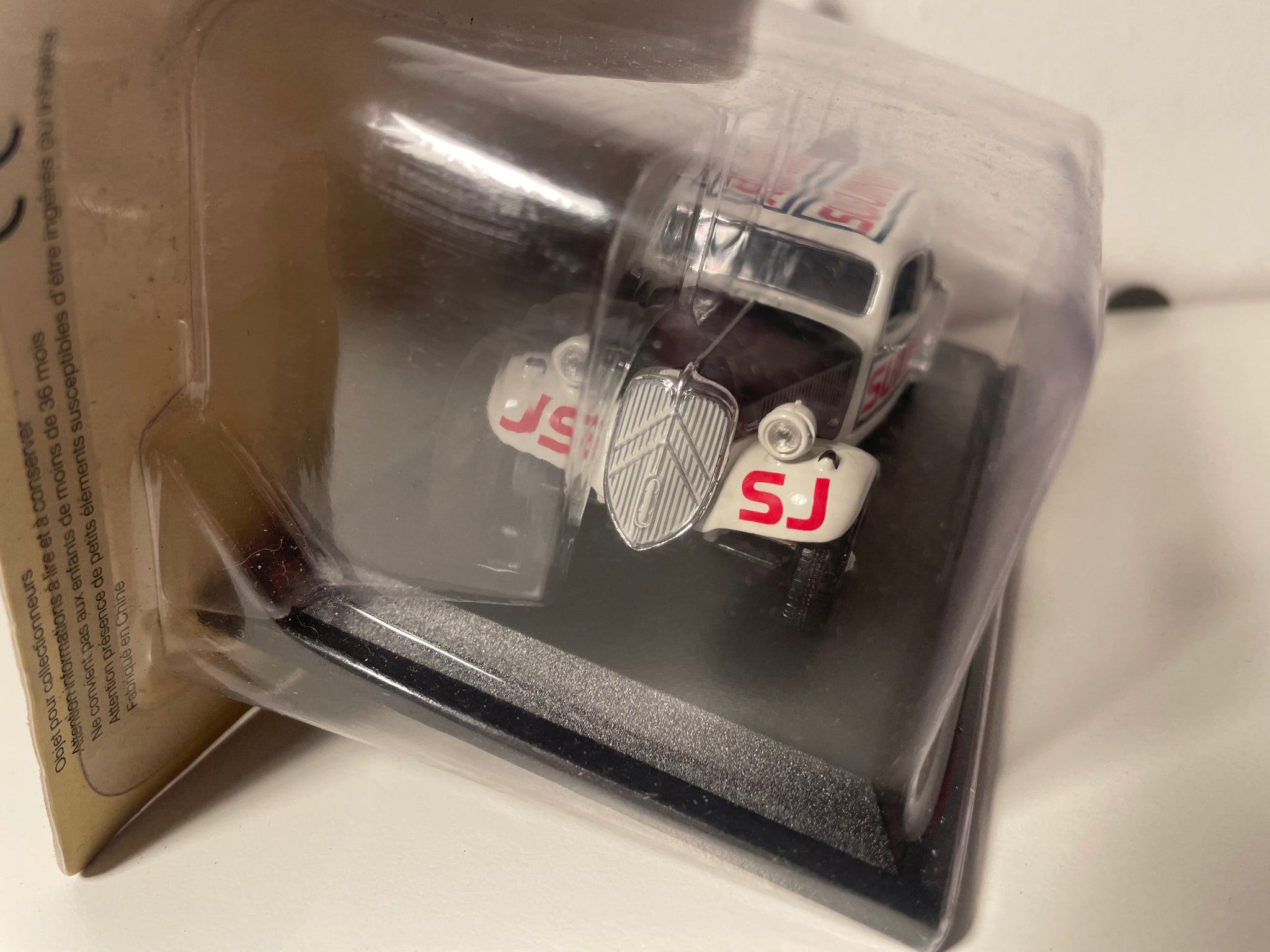 Descubre esta magnífica reproducción de la Citroën Traction 11B de 1955 en los emblemáticos colores blanco y negro, decorada específicamente con los colores del equipo de Cascadeurs Sunny dirigido por Jean Sunny. Esta miniatura captura la esencia de una época en la que los stuntmen automovilísticos cautivaban a las multitudes en ferias y espectáculos de toda Francia.