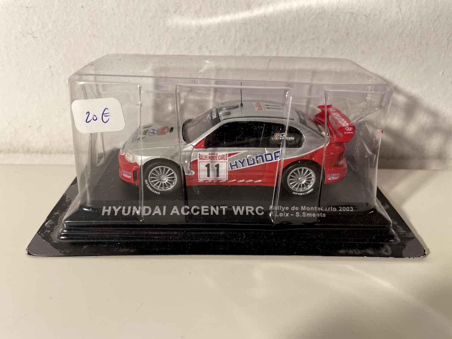Descubre este Hyundai Accent WRC número 11 que participó en el prestigioso Rally de Monte-Carlo 2003, pilotado por el dúo belga Freddy Loix y Sven Smeets. Esta miniatura a escala 1/43 captura perfectamente el espíritu combativo de esta compacta coreana en su característico color gris y rojo de la época.