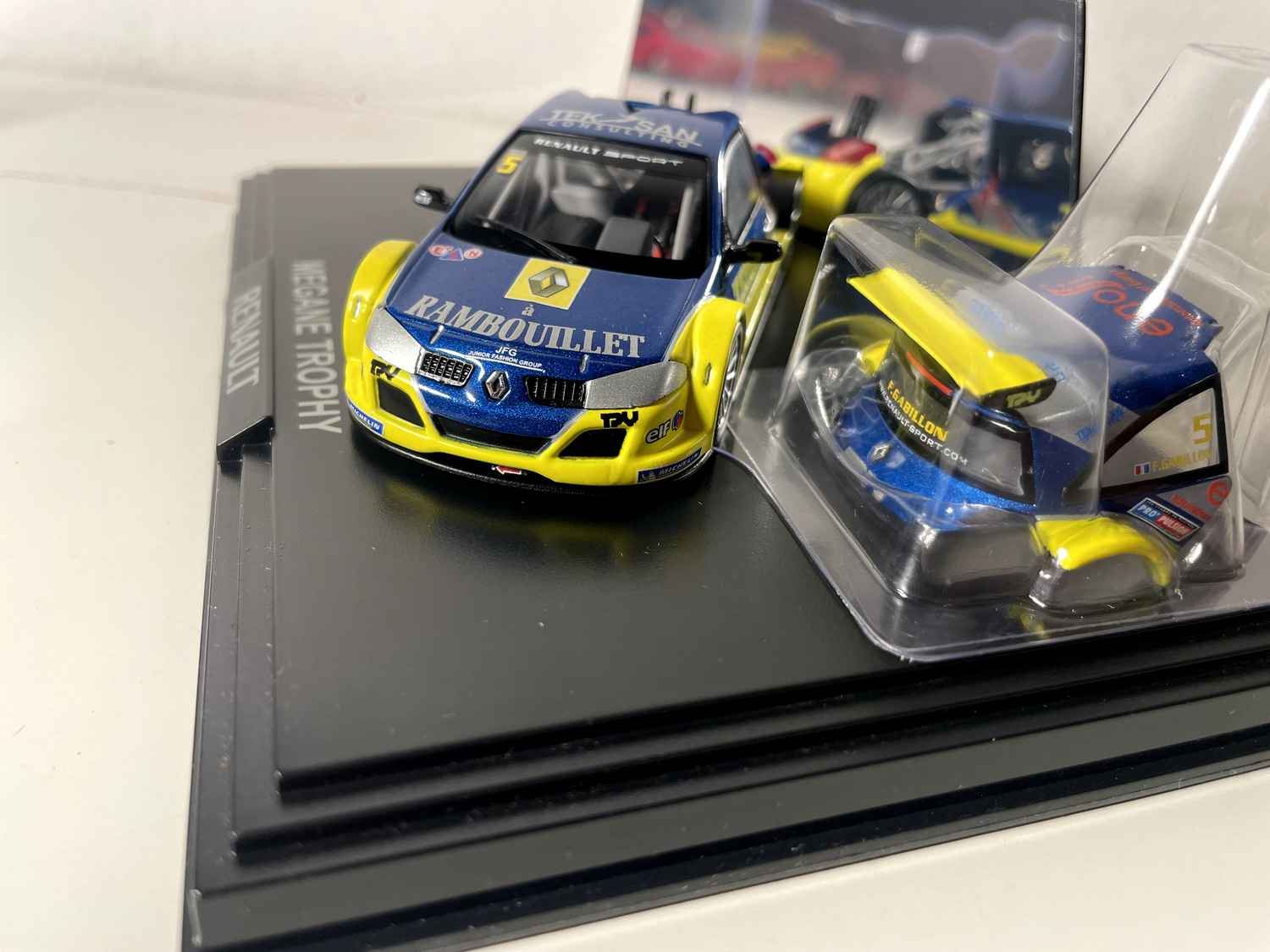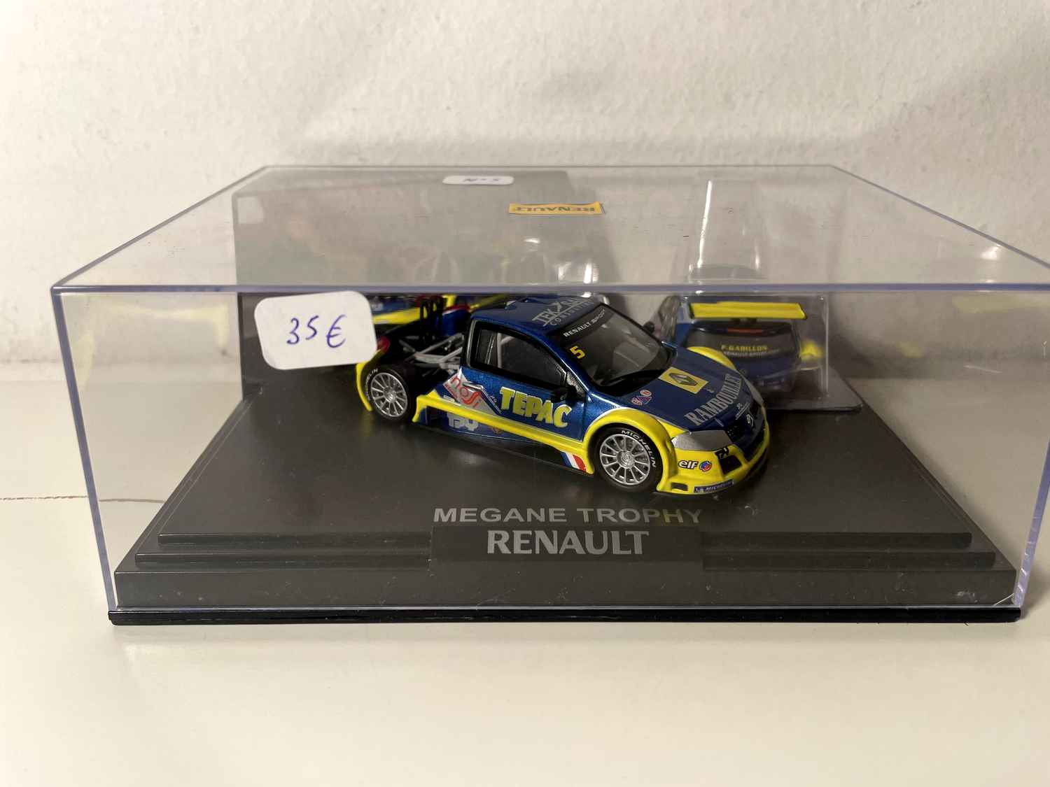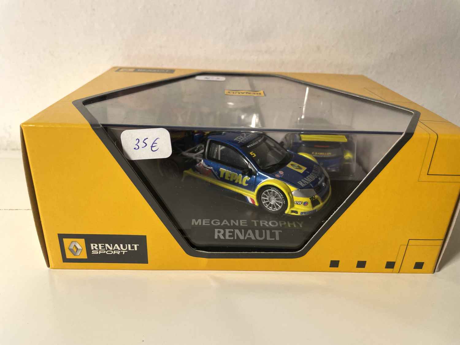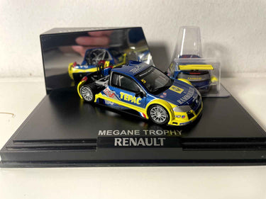 Descubre esta magnífica Mégane Trophy en miniatura, reproducción fiel del famoso deportivo francés desarrollado por Renault Sport. Esta versión de competición luce una atractiva decoración azul oscuro y amarillo, característica de los modelos participantes en el campeonato monomarca Renault.