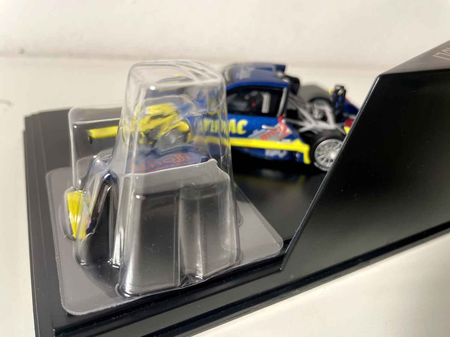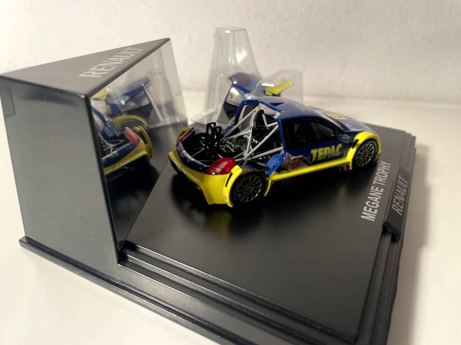 Equipado con un motor V6 de 3.5 litros que desarrolla casi 350 caballos, el Mégane Trophy mostraba un rendimiento notable con una velocidad máxima que superaba los 280 km/h. Su chasis tubular, su carrocería de fibra de carbono y su aerodinámica trabajada lo convertían en un auténtico coche de carreras, lejos de sus orígenes en la carretera. La decoración azul y amarilla reproducida en esta miniatura era una de las más apreciadas del campeonato.