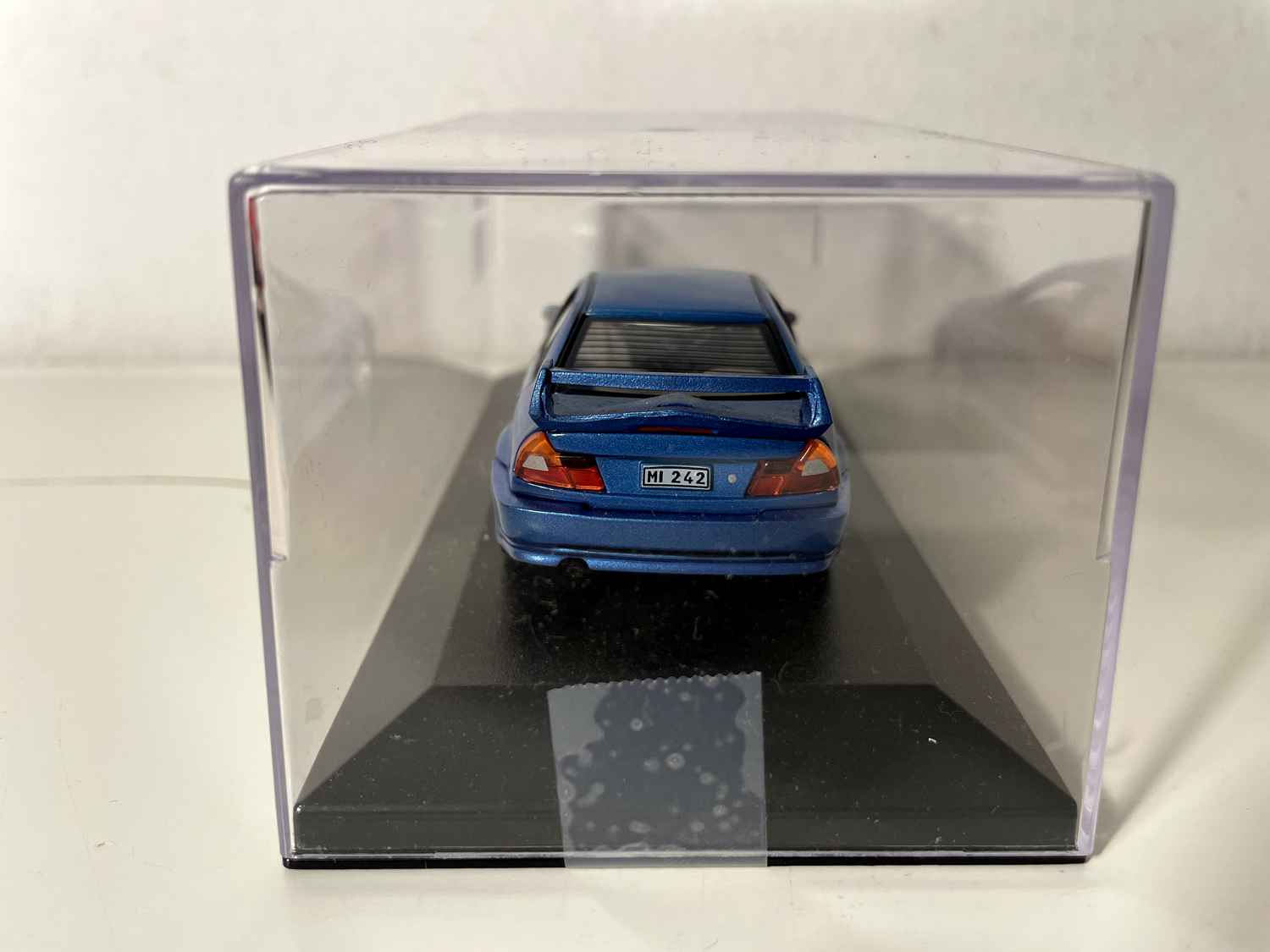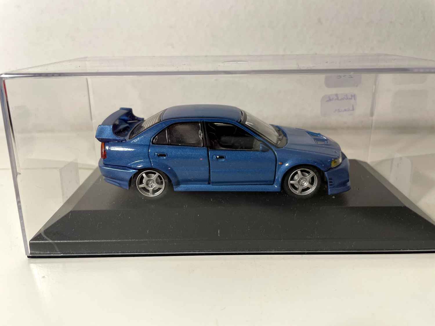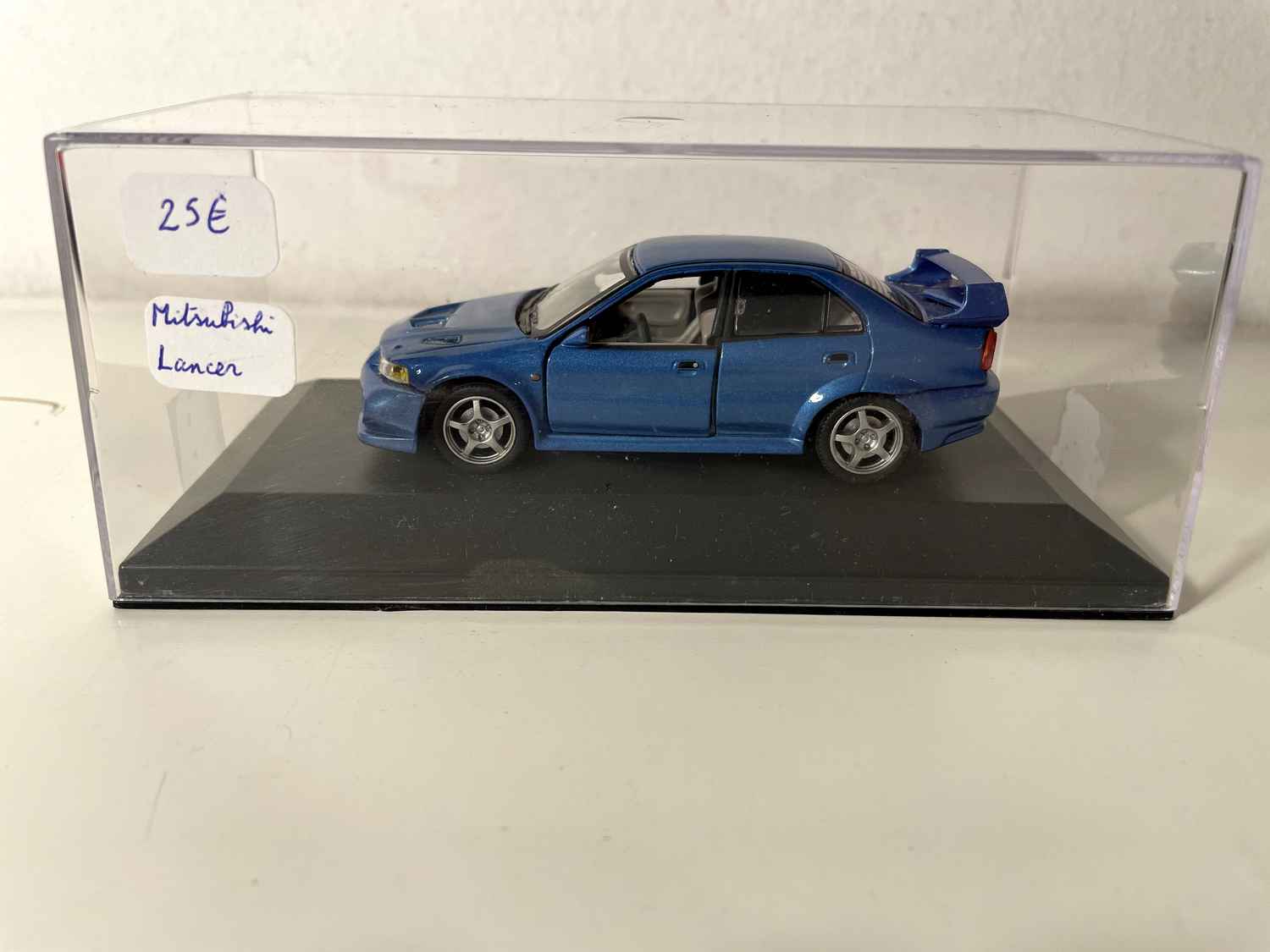 Coche en Miniatura Mitsubishi Lancer bleue (voiture rajoutée sur un socle)