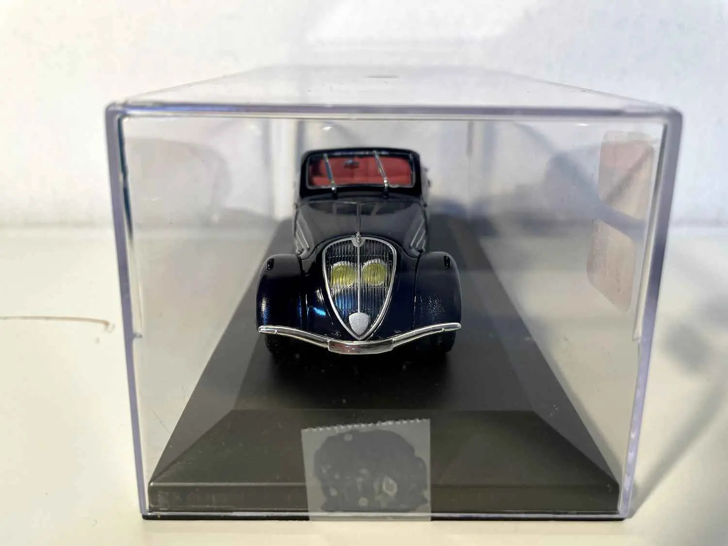 Esta miniatura del Peugeot 402 descapotable azul oscuro representa uno de los modelos más emblemáticos del automovilismo francés de la década de 1930. Reproducida con una notable atención al detalle a escala 1:43, esta pieza de coleccionista captura a la perfección el espíritu Art Déco y la innovación técnica que caracterizaron esta época dorada de la industria automotriz.