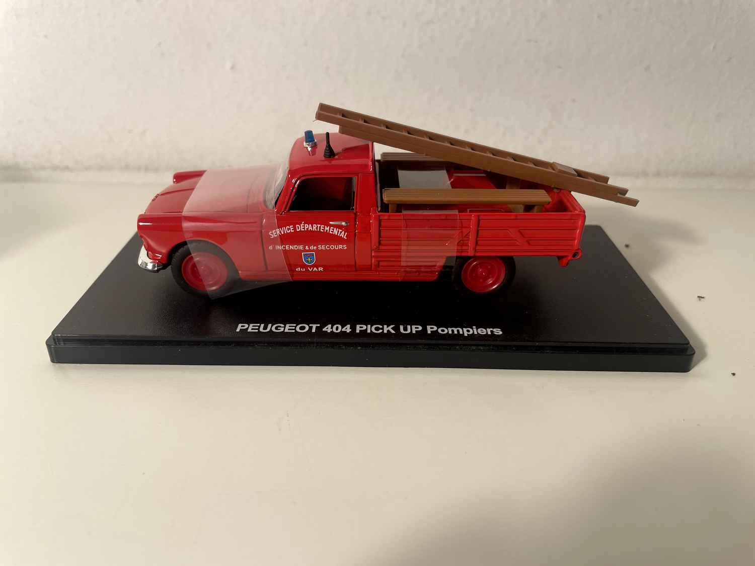 Estos 404 pick-up de bomberos eran a menudo adaptados de manera artesanal por los servicios técnicos departamentales. Se les instalaban compartimentos estancos para las mangueras, soportes para escaleras portátiles y a veces incluso pequeñas bombas de apoyo. Su color rojo reglamentario, realzado con bandas reflectantes blancas, los hacía inmediatamente identificables.
