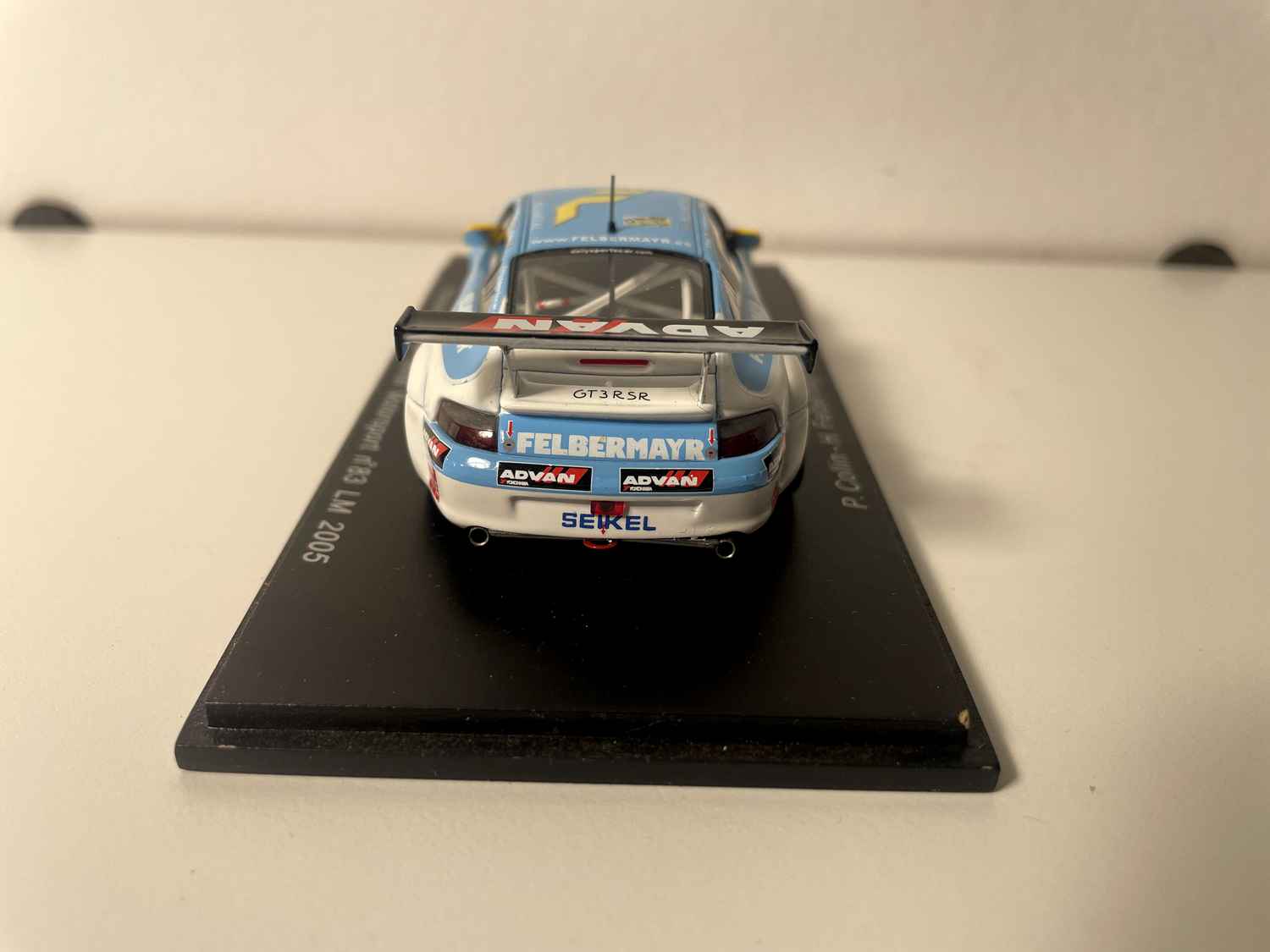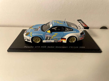 Descubre este magnífico Porsche GT3 RSR Seikel Motorsport en los icónicos colores azul y blanco, portando el número 83 que marcó las 24 horas de Le Mans 2005. Esta miniatura SPARK captura a la perfección la esencia de la competición de resistencia y constituye un verdadero testimonio del compromiso de Porsche en esta carrera mítica.