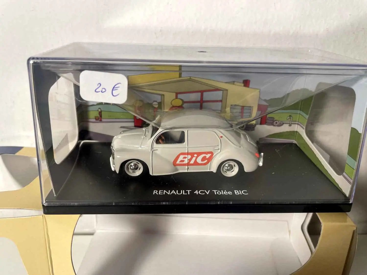 Renault 4CV con panel gris y publicidad BIC: una miniatura icónica de los años 50