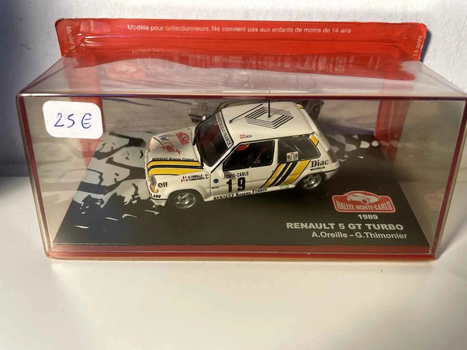 Esta miniatura del Renault 5 GT Turbo, en vibrantes blanco y amarillo, luce con orgullo el número 19, inmortalizando su participación en el prestigioso Rally de Montecarlo de 1989. Pilotada por la tripulación de A. Oreille y G. Thimonier, esta versión reproduce fielmente uno de los coches de rally más emblemáticos de los años 80. Esta pieza de coleccionista captura a la perfección el espíritu deportivo y la audacia técnica que forjaron la reputación de la marca del rombo en el mundo del automovilismo.