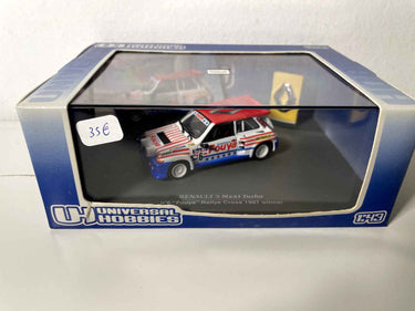 Coche en Miniatura Renault 5 Maxi Turbo azul, blanco y rojo + rayas con el dorsal 6 "Fouya", ganador del rally cross de 1987 (caja rectangular)