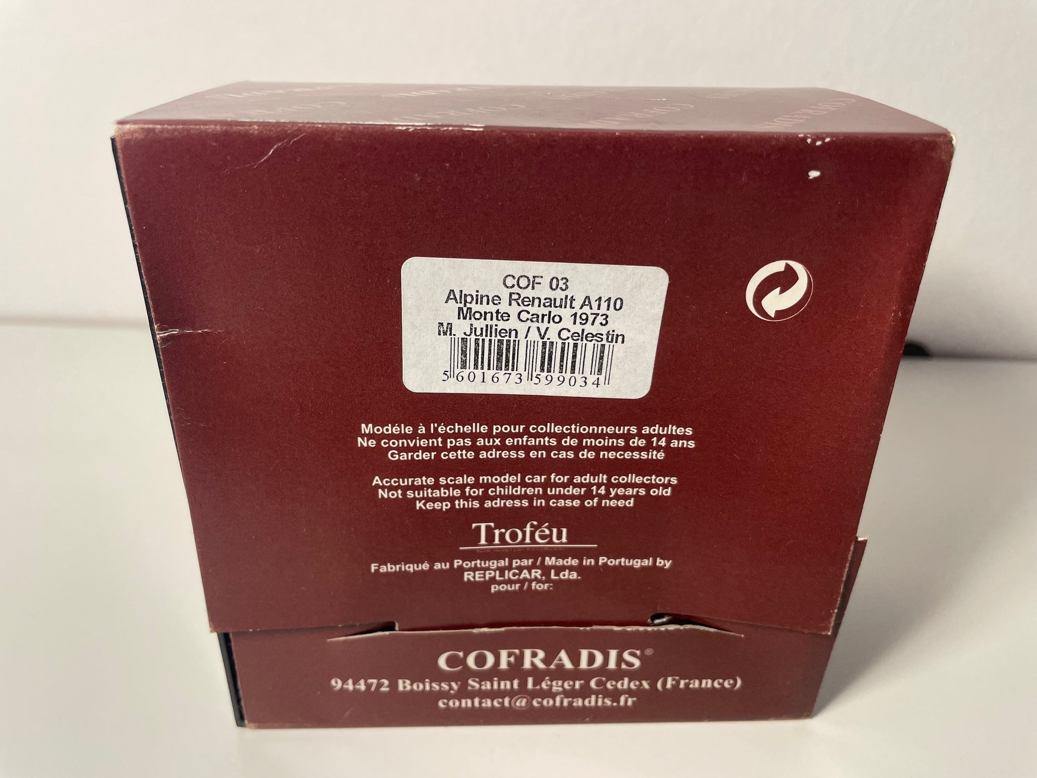Coche en Miniatura Renault Alpine A110 rojo, blanco y violeta número 55 - rallye de Monte-Carlo de 1973 - TROFEU referencia COF 03 (edición limitada)