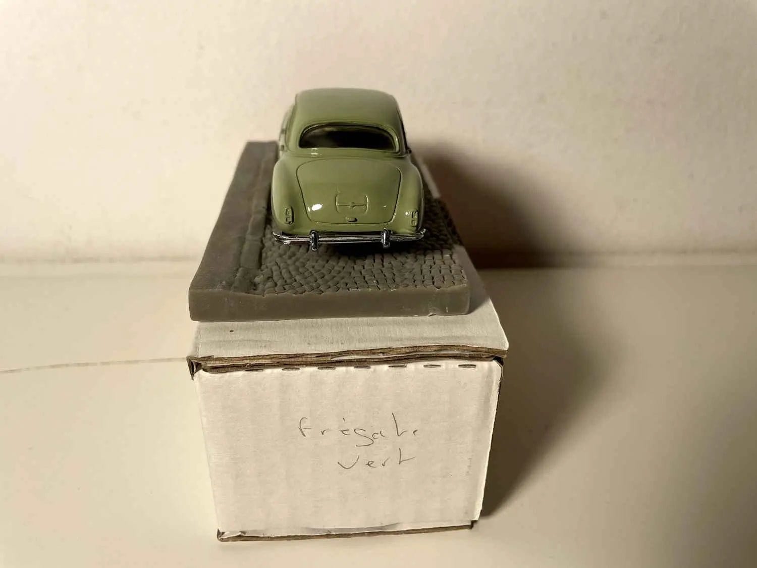 El Renault Frégate Amiral, de librea verde, representa una de las berlinas más prestigiosas de la posguerra francesa. Esta maqueta a escala 1:43 captura sutilmente la elegancia burguesa de un modelo que influyó profundamente en la industria automotriz francesa de la década de 1950.
