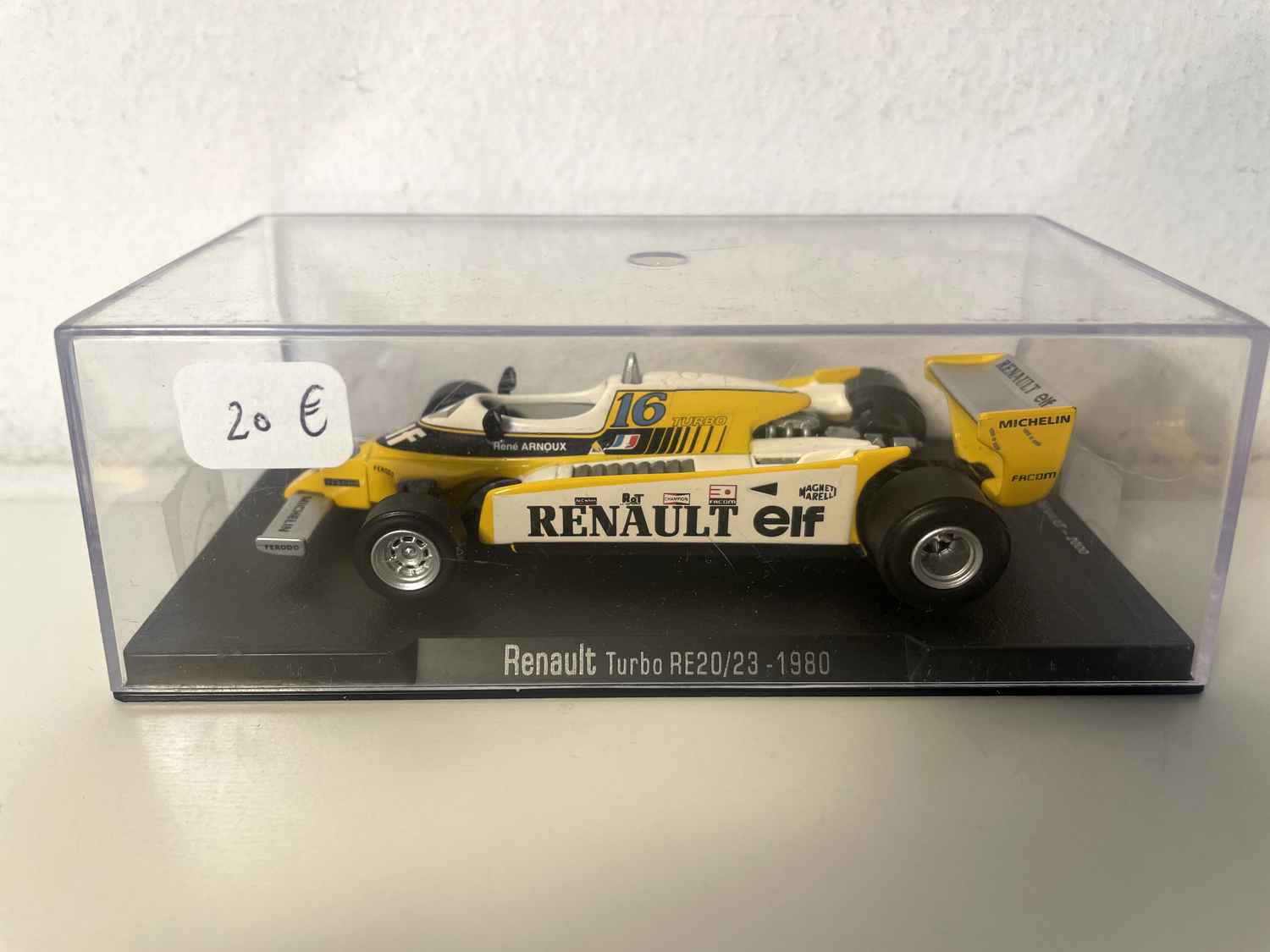Coche en Miniatura Renault Turbo RE20/23 amarillo y blanco número 16 de 1980 (Fórmula 1)