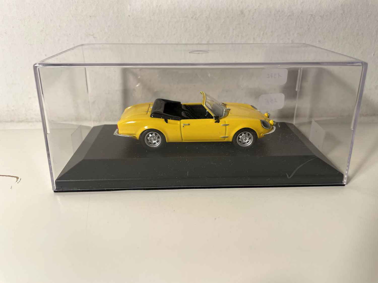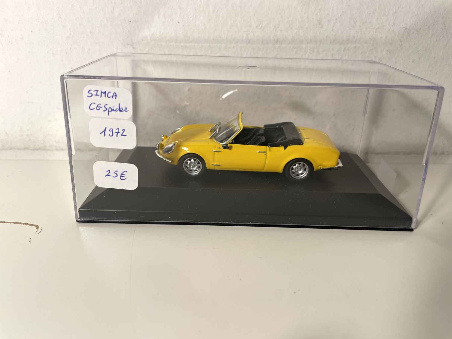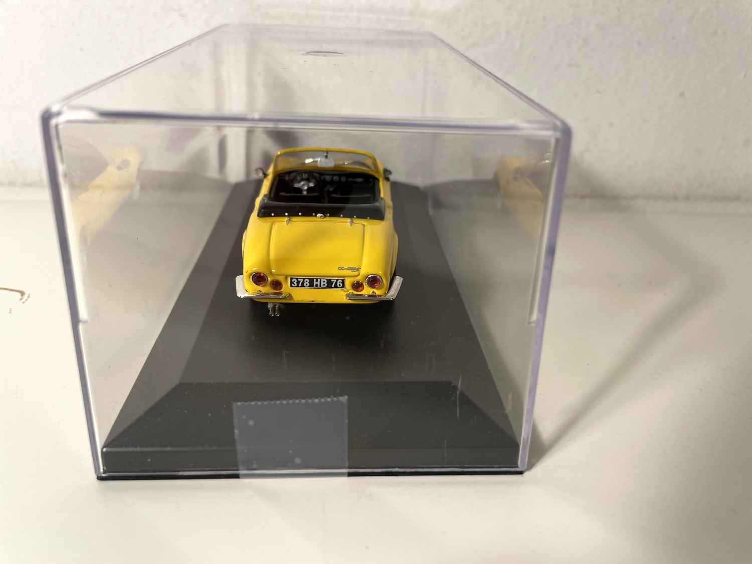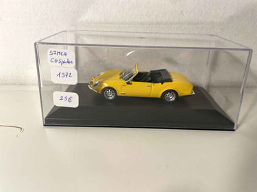 Coche en Miniatura Simca CG Spider jaune de 1972 (voiture rajoutée sur un socle)