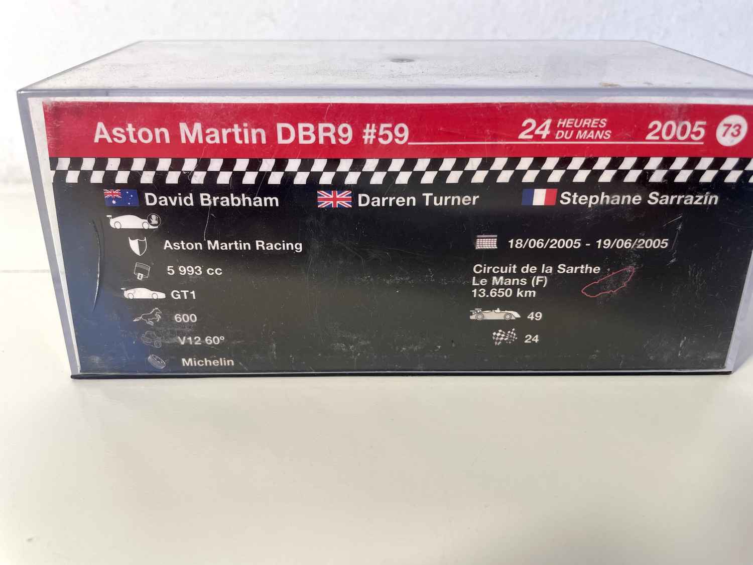 Questa Aston Martin DBR9 #59 trova naturalmente il suo posto accanto ad altre leggende dell'endurance . Si adatta perfettamente alle miniature Ferrari della stessa epoca, in particolare alla 550 e alla 575 Maranello, che furono le sue principali rivali in GT1. I collezionisti apprezzeranno anche l'associazione con la Porsche 911 GT3 RSR o la Chevrolet Corvette C6.R dello stesso periodo.