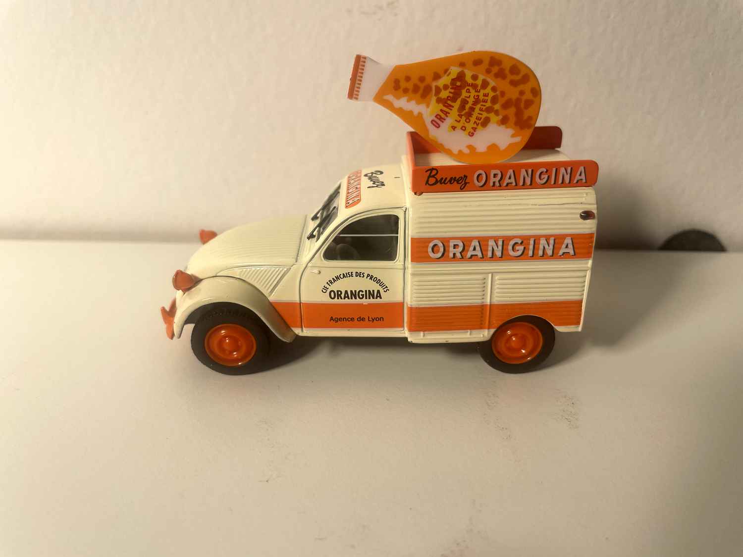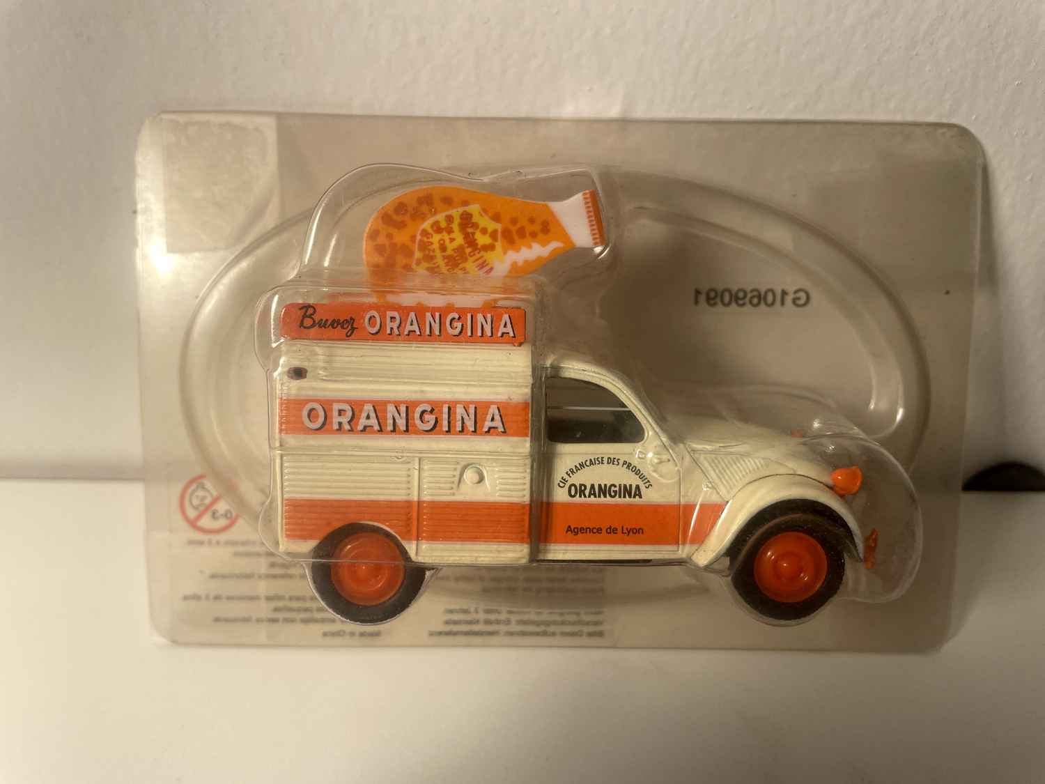 Modellini di Auto Furgonetta Citroën 2 CV AZU arancione e crema con pubblicità ORANGINA - Norev