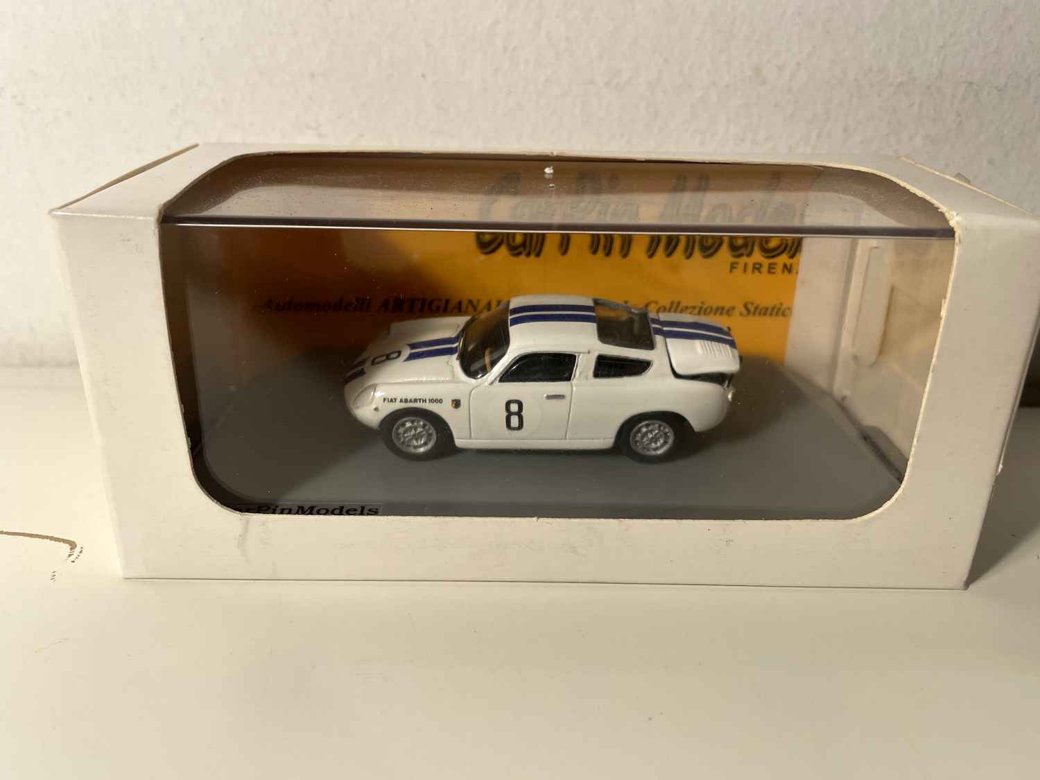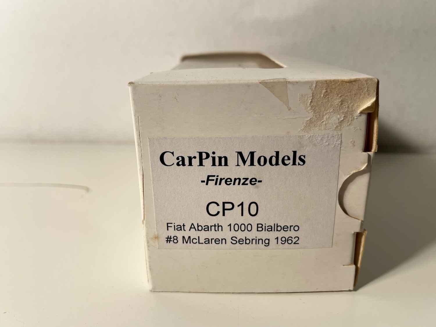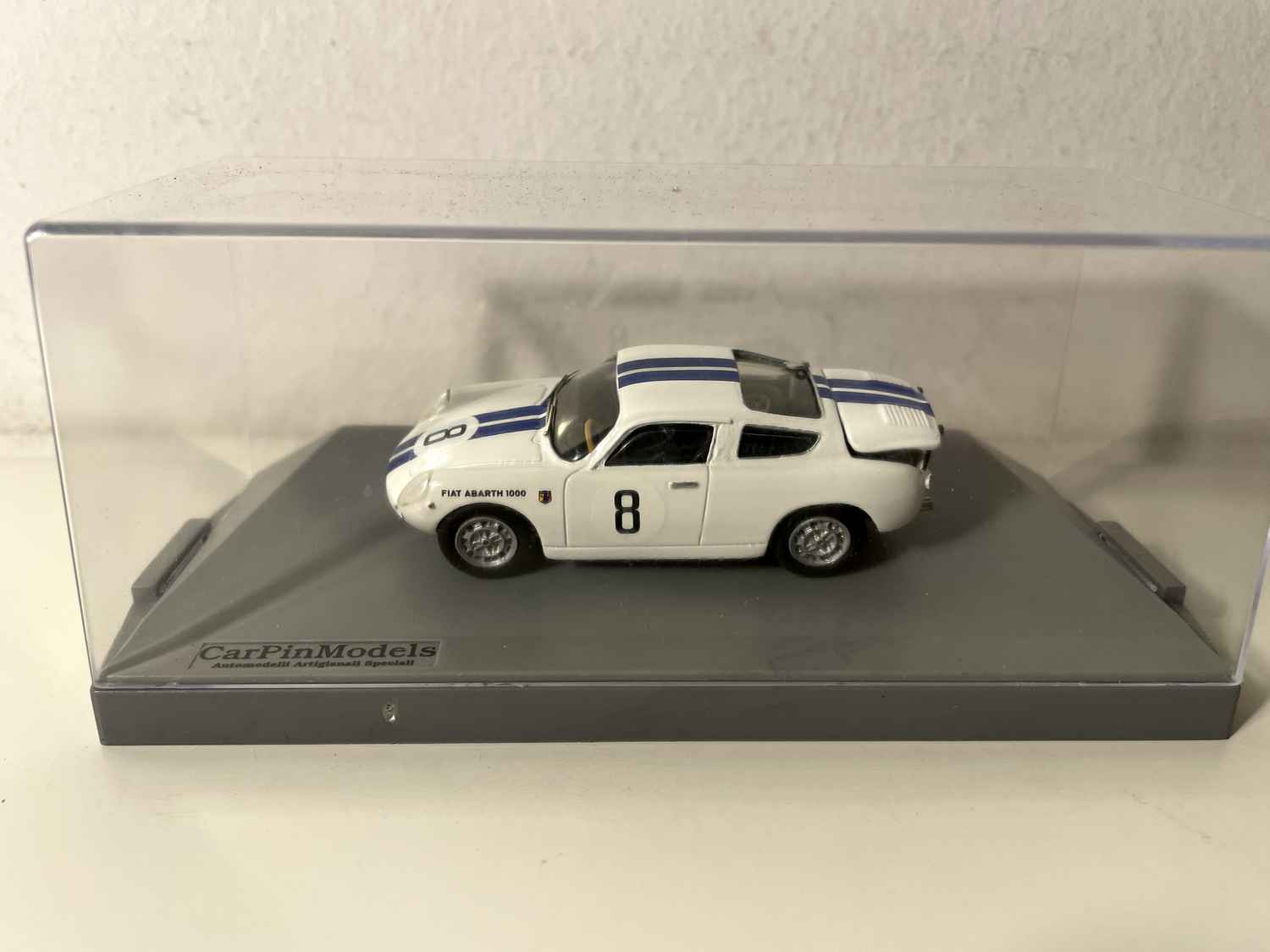 Modellini di Auto Fiat Abarth 1000 Bialbero bianco e blu numero 8 - 12 ore di Sebring (Florida) del 1962 - collezione CarPin Models