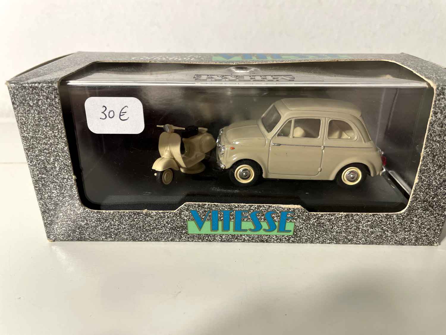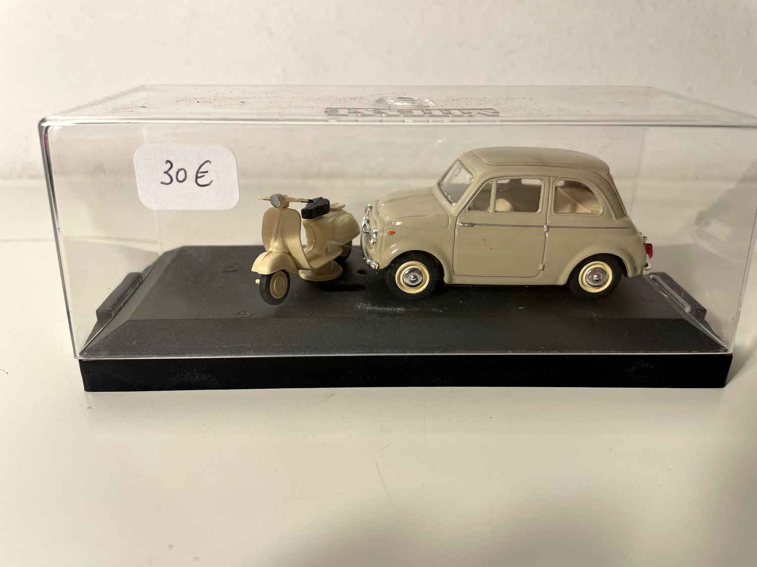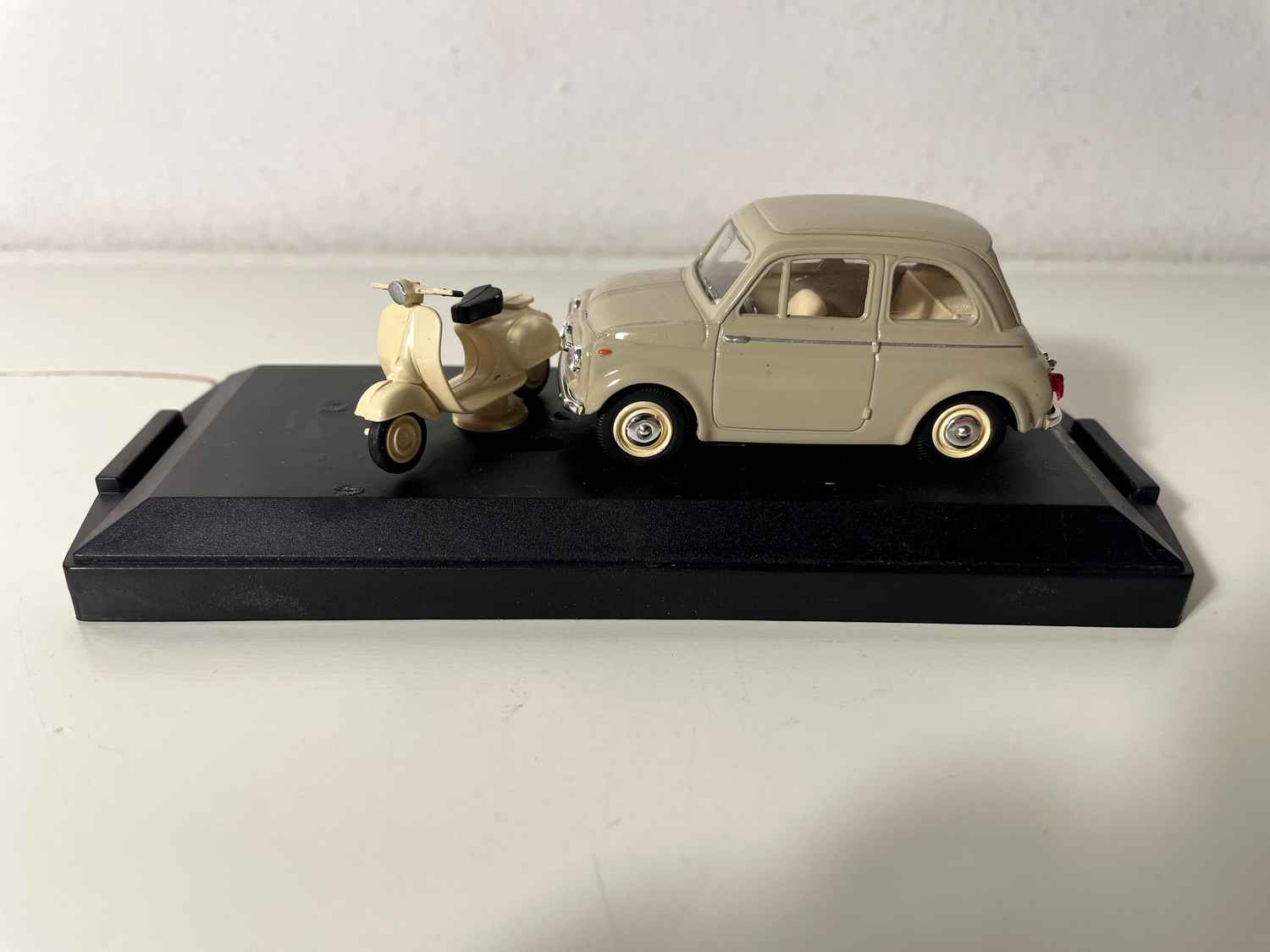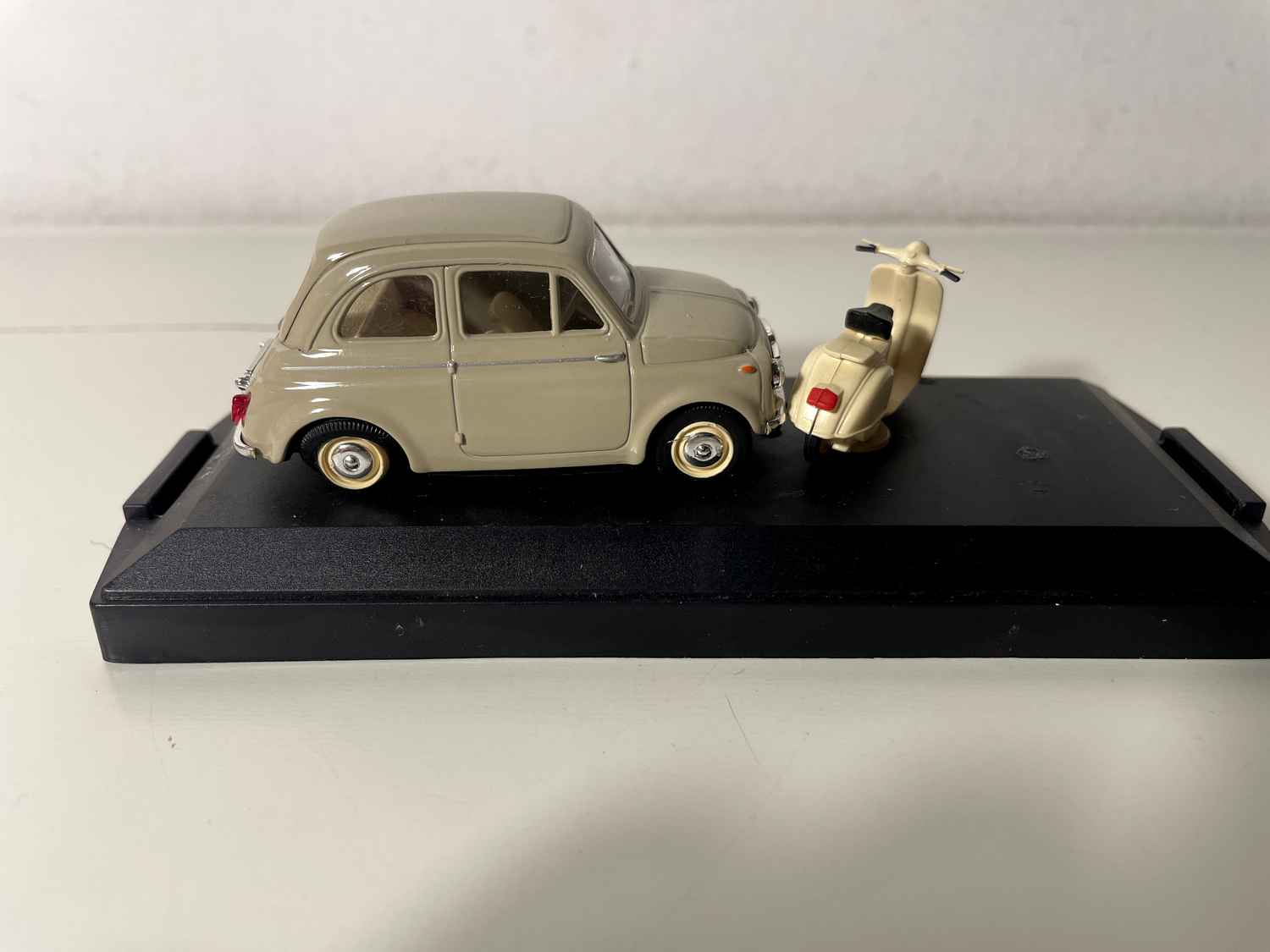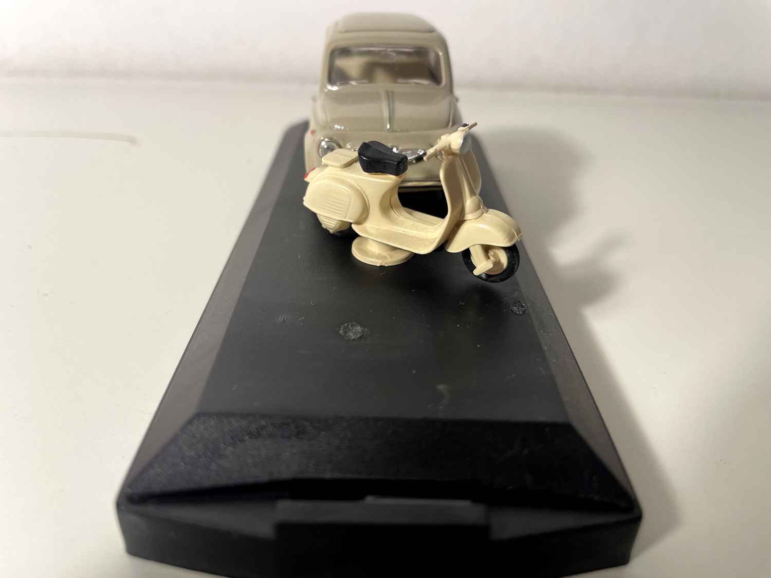 Modellini di Auto Fiat Steyr-Puch 650T (versione austriaca derivata dalla Fiat 500) beige/marrone chiaro con una Vespa - Collezione Vitesse riferimento 031