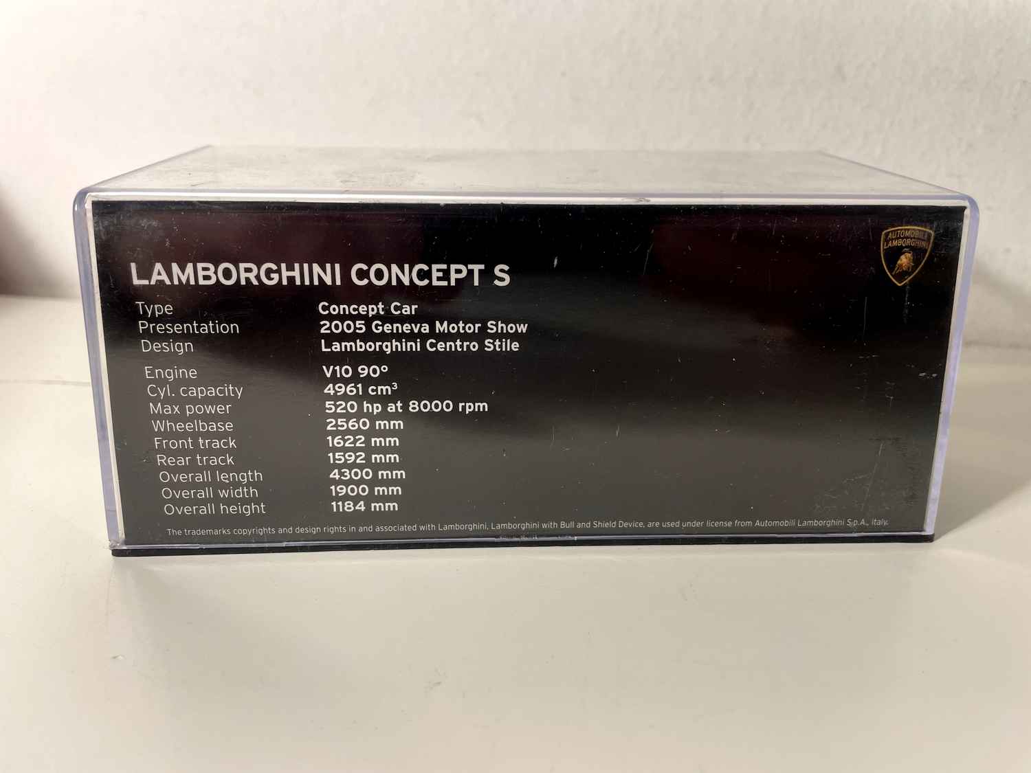 La Lamborghini Concept S nasce nel 2005 nei laboratori di Sant'Agata Bolognese sotto la direzione di Luc Donckerwolke, all'epoca direttore del design di Lamborghini. Basata sulla piattaforma della Gallardo, questa creazione unica porta il design alla sua massima espressione immaginando una versione speedster radicale. Il concetto rivoluziona l'approccio tradizionale al roadster eliminando completamente il parabrezza a favore di due caschi integrati.