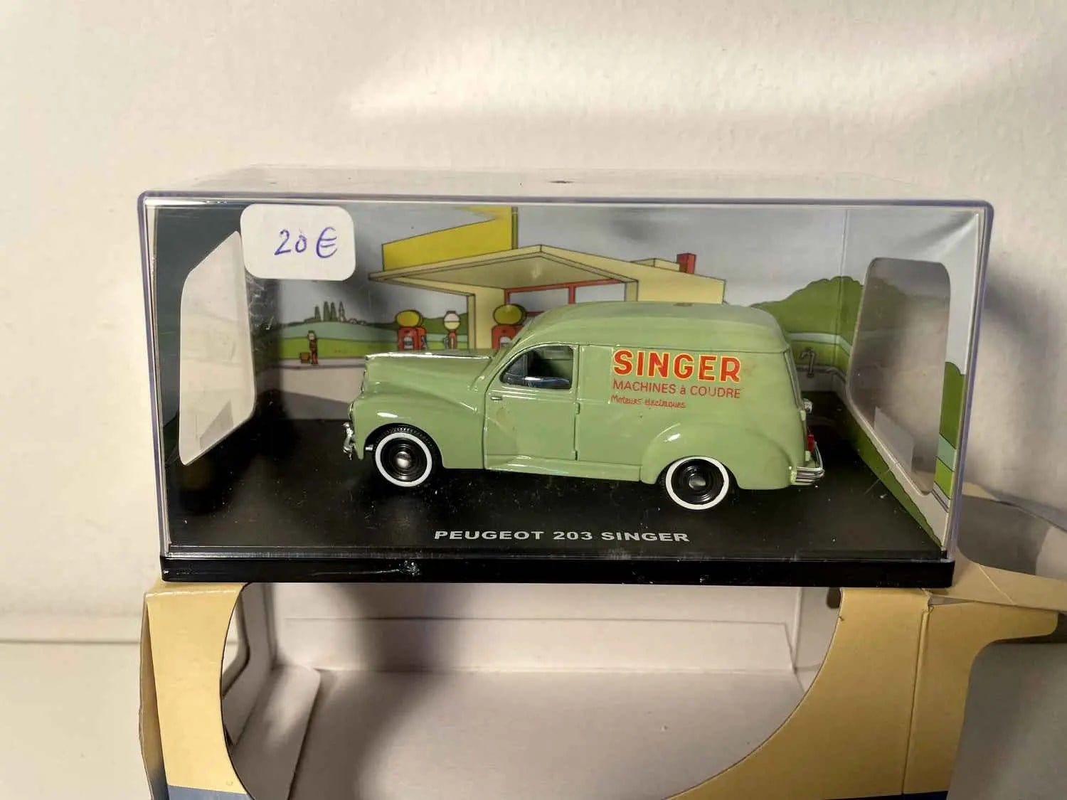 Questa miniatura in scala 1/43 della Peugeot 203 verde esibisce con orgoglio la pubblicità della Singer , a testimonianza di un'epoca in cui i veicoli commerciali erano veri e propri mezzi pubblicitari ambulanti. Questa fedele riproduzione cattura l'essenza della Francia degli anni '50 in una ricostruzione completa, dove ogni dettaglio conta per gli appassionati collezionisti di automobili francesi.