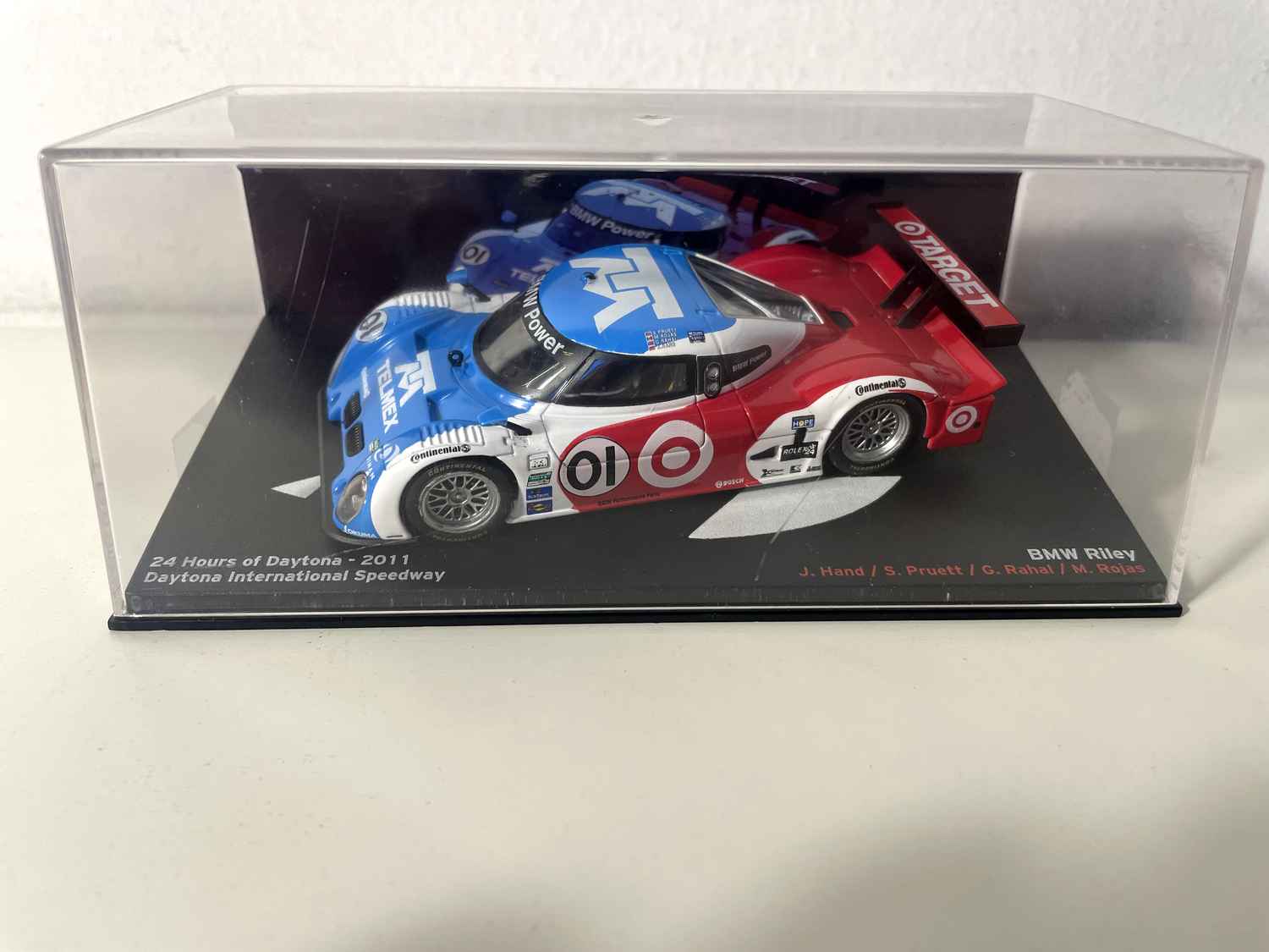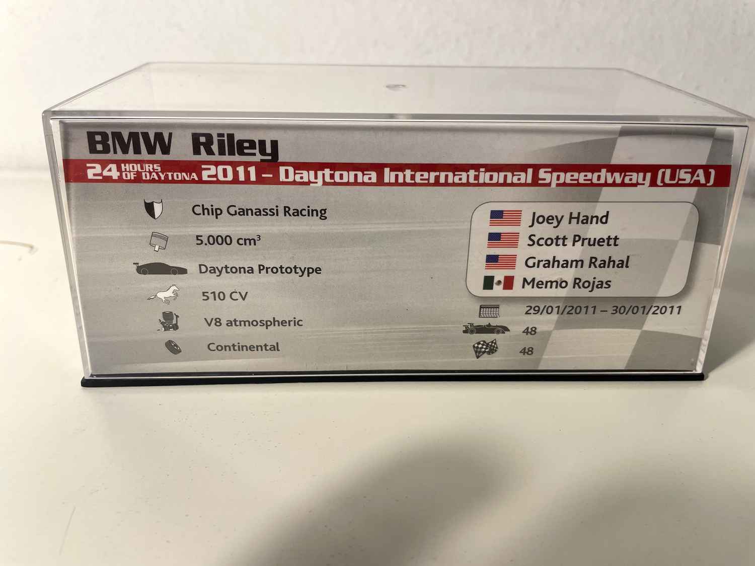 Dës BMW Riley vu Daytona 2011 passt natierlech seng Plaz mat den aneren BMW Miniaturautos an all Kollektionen consacriéiert dem Auto-Sport. Si harmonéiert perfekt mat den Miniaturen vun 24 Stunden Le Mans an aner impactewe Schwéiss.