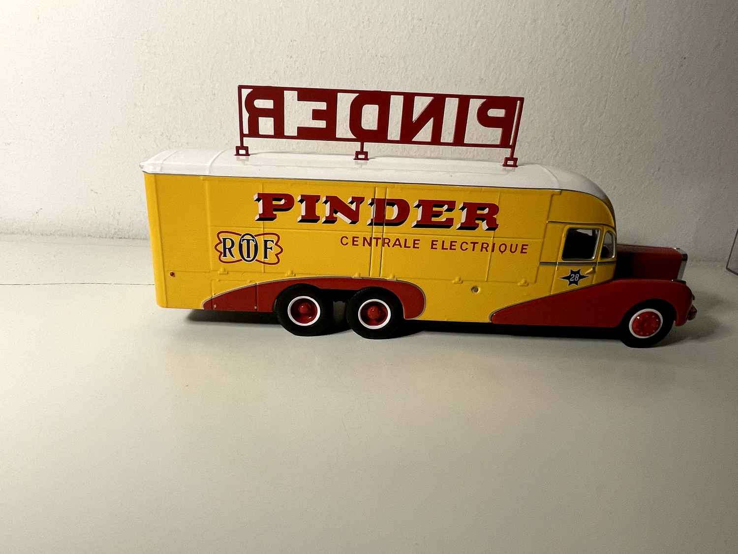 Dës Bernard 110MB Pinder Miniatur passt perfekt an eng Kollektioun, déi franséisch Gebrauchsfahrzeugen gewidmet ass . Si harmonéiert besonnesch gutt mat anere Modeller vu schwéiere Lastwagen aus der selwechter Period oder mat Gefierer mat opfällegen Reklammelackéierungen.