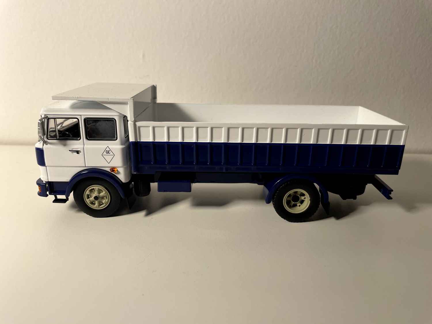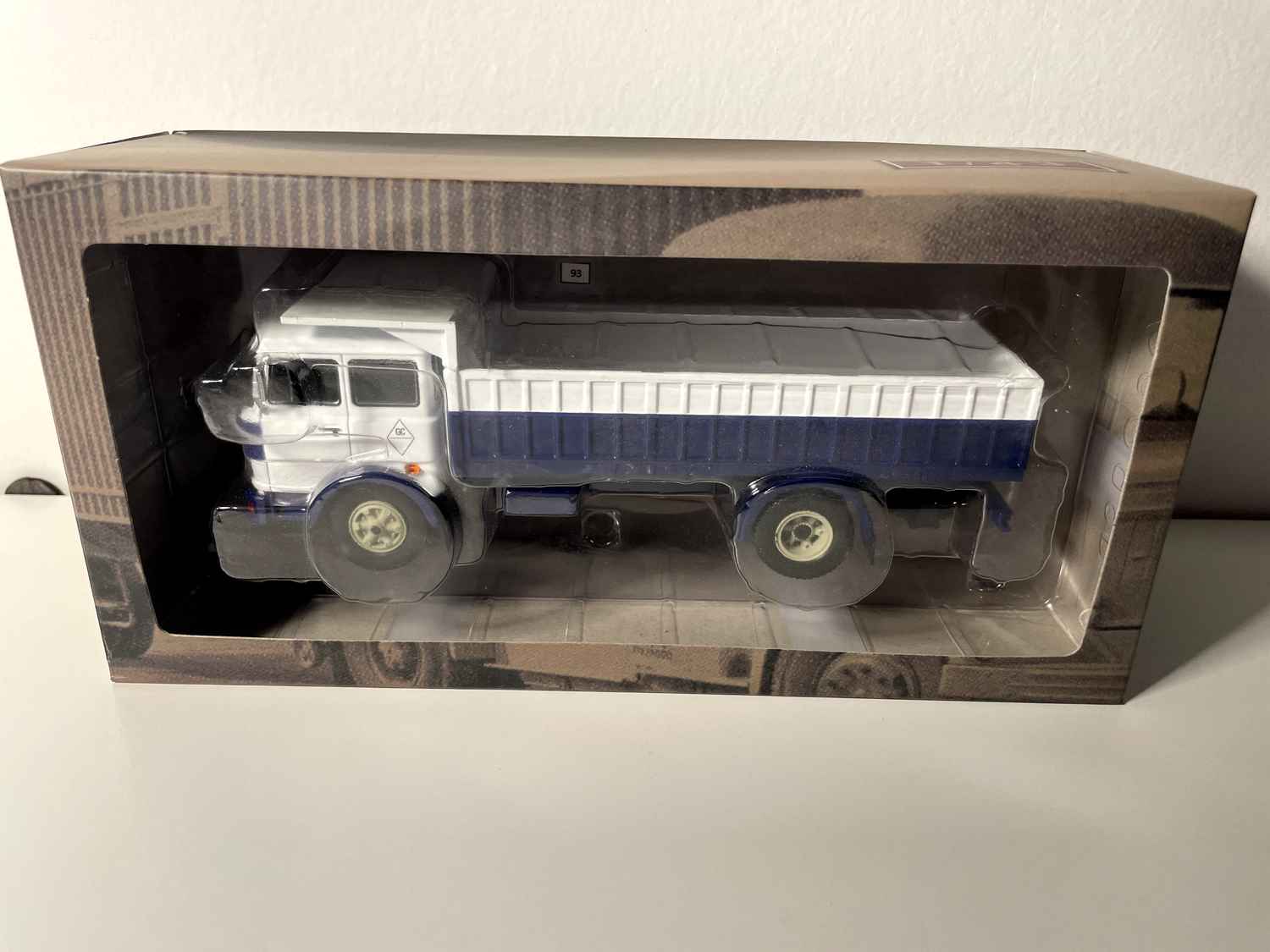 Modellauto FIAT IVECO 619 Camion mat wäisser Kabinn a blo-wäisser Kipperlaascht