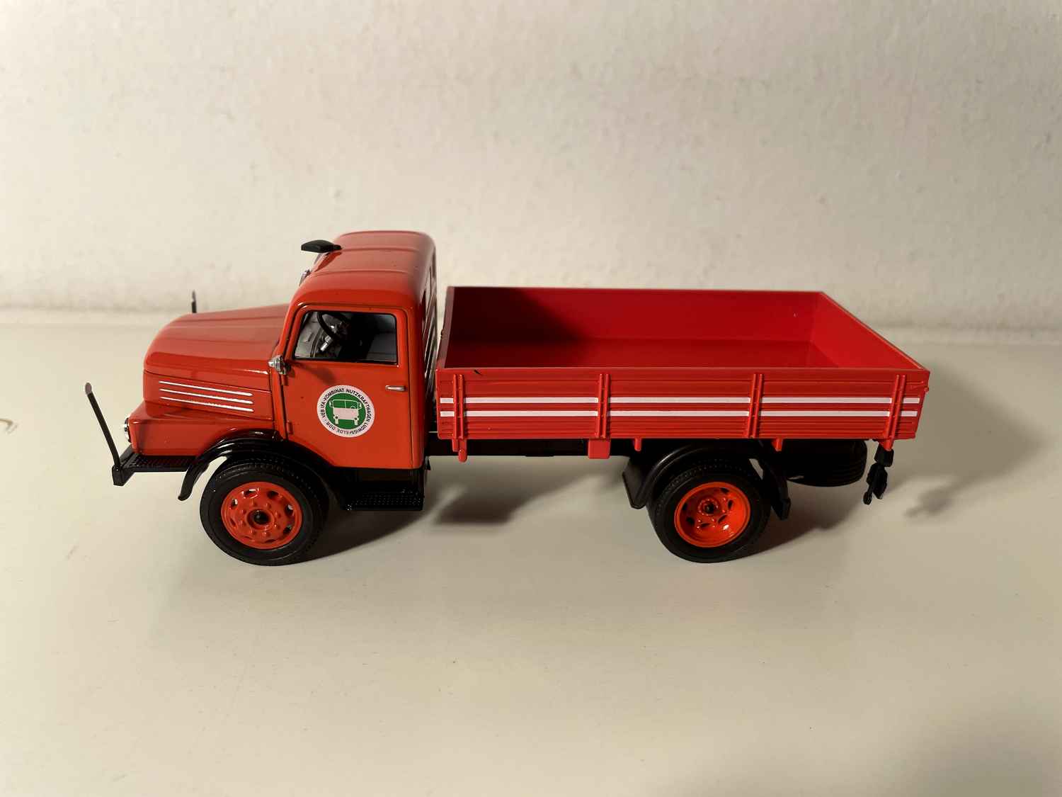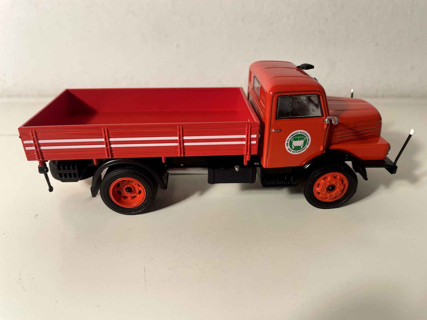 Dës Reproduktioun am Moossstaf 1/43 ass en aussergewéinlecht Sammlerstéck , dat d'Qualitéit vun der Fabrikatioun an d'Opmierksamkeet op Detailer weist, déi prestigiéis Utility Vehicles charakteriséieren. Seng knallrout Plattform an dat markant Logo maachen et zu engem besonnesch gesichte Stéck fir Fans vun däitsche Miniaturen.