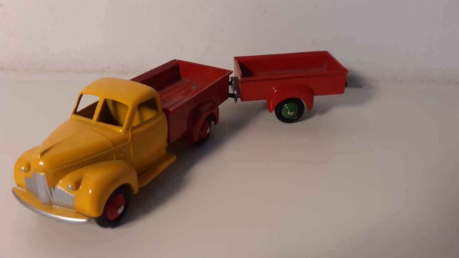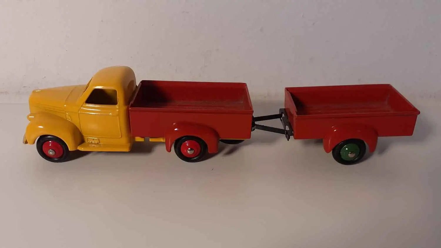Dësen Dinky-Toys roude Camion mat gieler Kabinn a roudem Unhänger vun Éditions Atlas representéiert d'Essenz vum Stroossentransport an den 1950er an 1960er Joren. Dës trei reproduzéiert Miniatur fängt de Geescht vun de grousse Stroossenzich an, déi d'europäesch Stroosse kräizt hunn, eng gëllen Zäit, an där den Camionstransport d'franséisch Wirtschaft revolutionéiert huet. Als richtegt Sammlerstéck weist dëst Stéck d'legendär Expertise vun Dinky-Toys an der Reproduktioun vun Utility Vehicles.