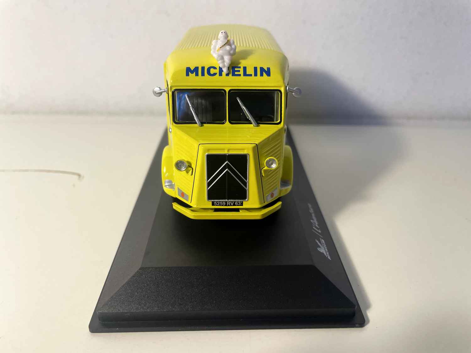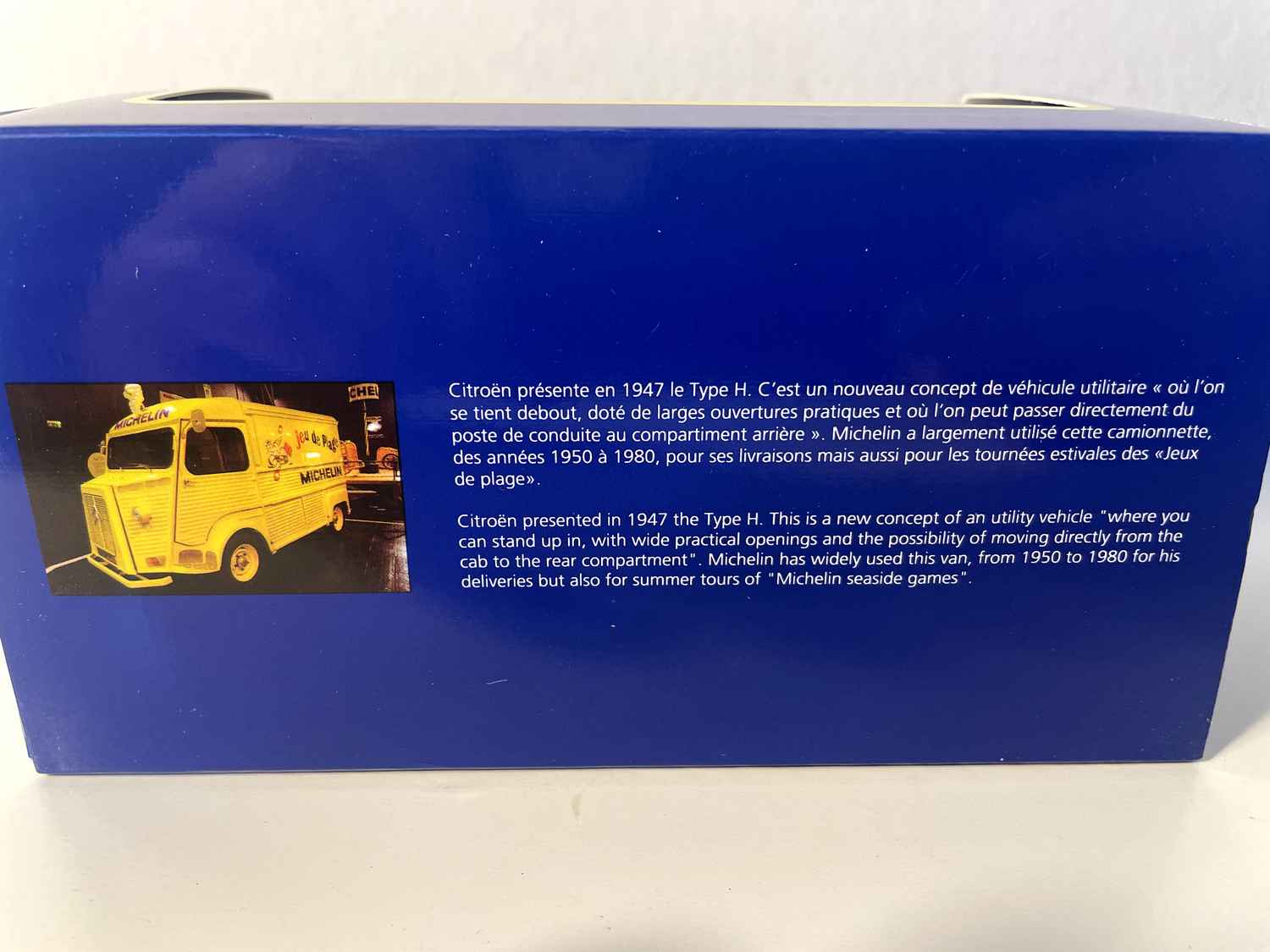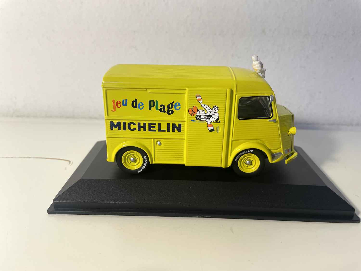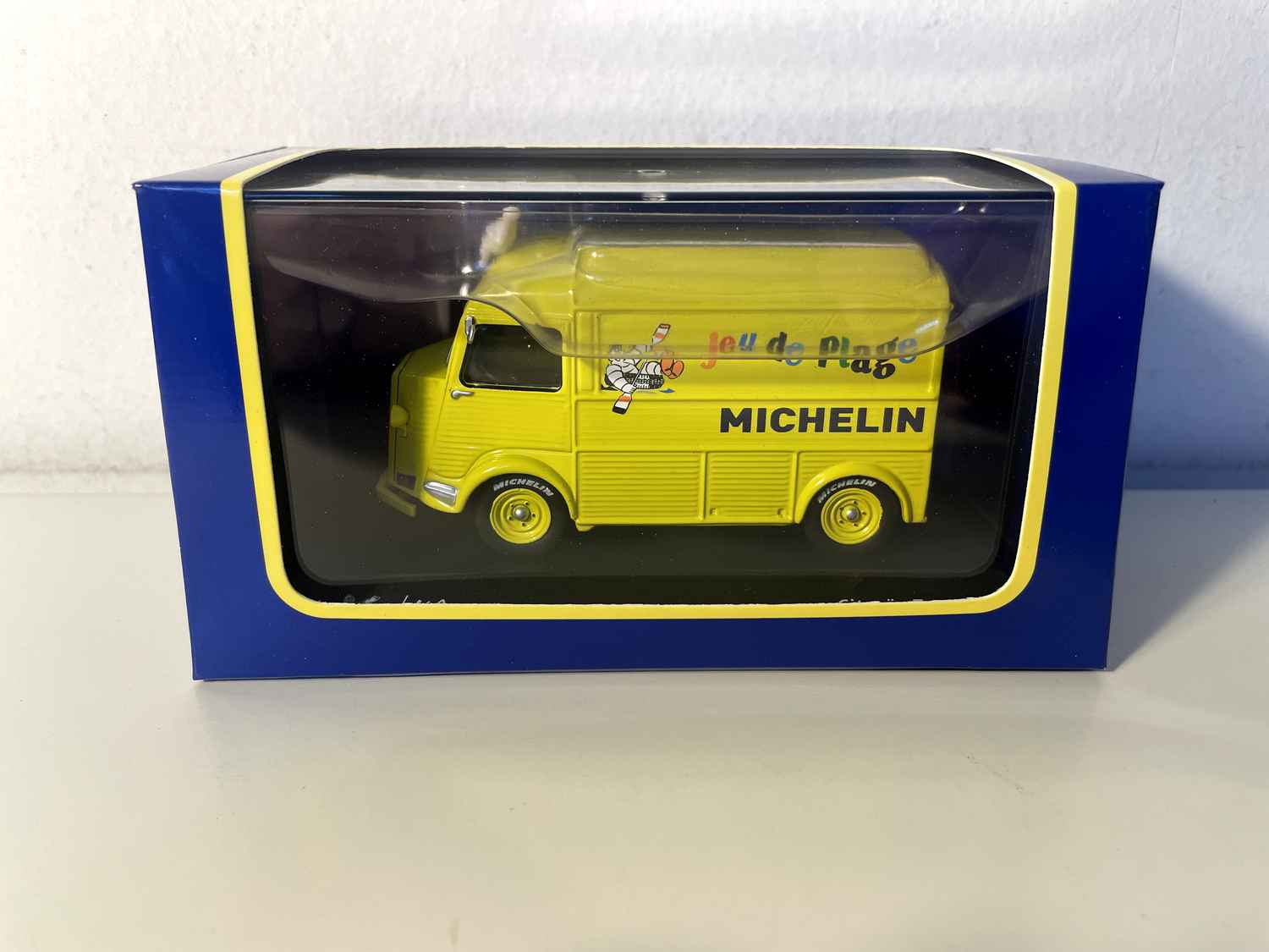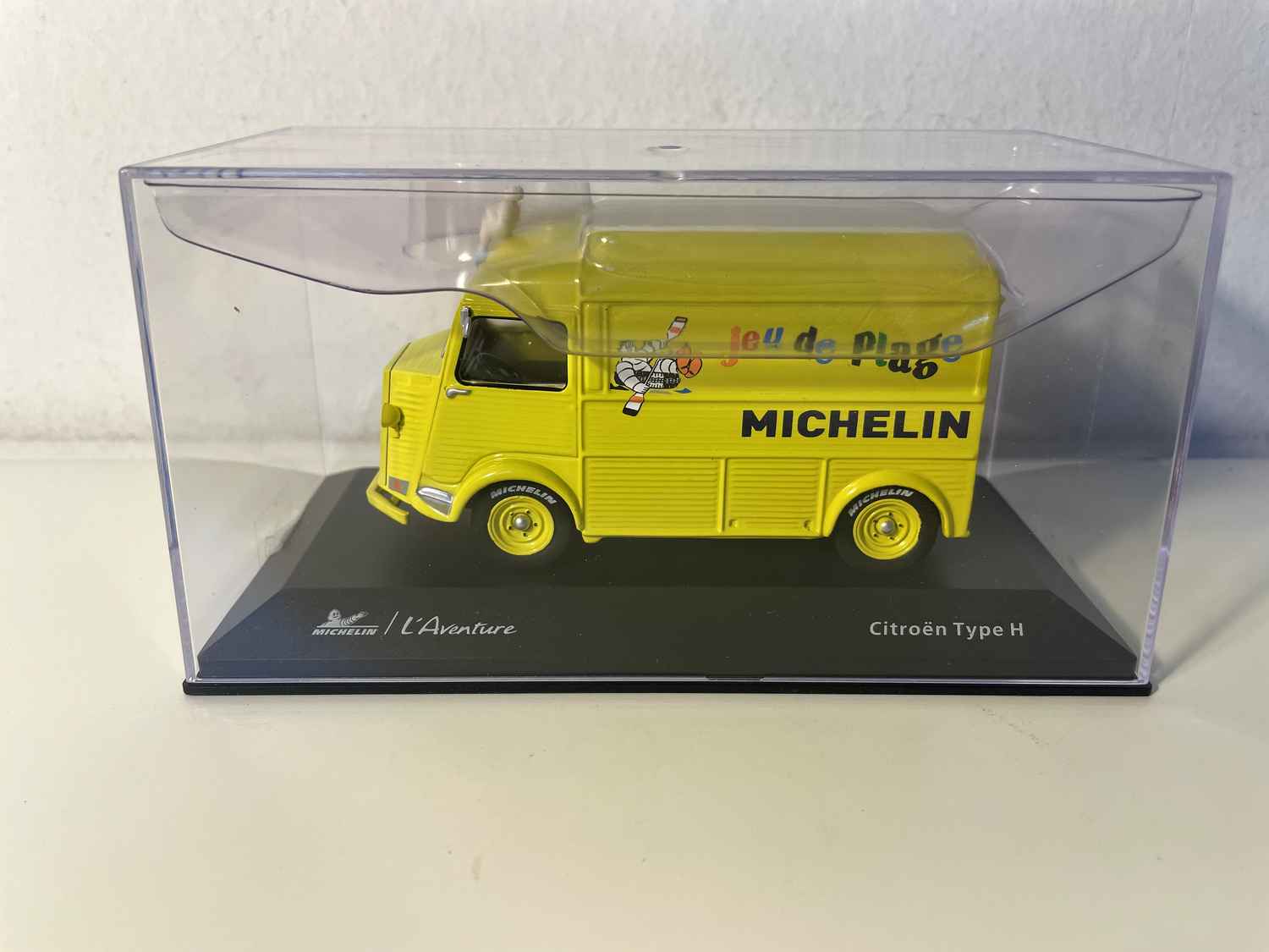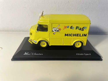 Dëse miniatur Citroën Type HY giel Michelin am Summerfaarwen, fängt d’Essenz vun der Fréijoersvakanz an Frankräich. Geschmückt mat dem berüchtegte Logo vun der Mark mam Bibendum an der Schreiwung "Spill vun der Plage", rufft et direkt d’Familjevakanz an d’sommerlech Flucht vun de Joren 1960-70 op.