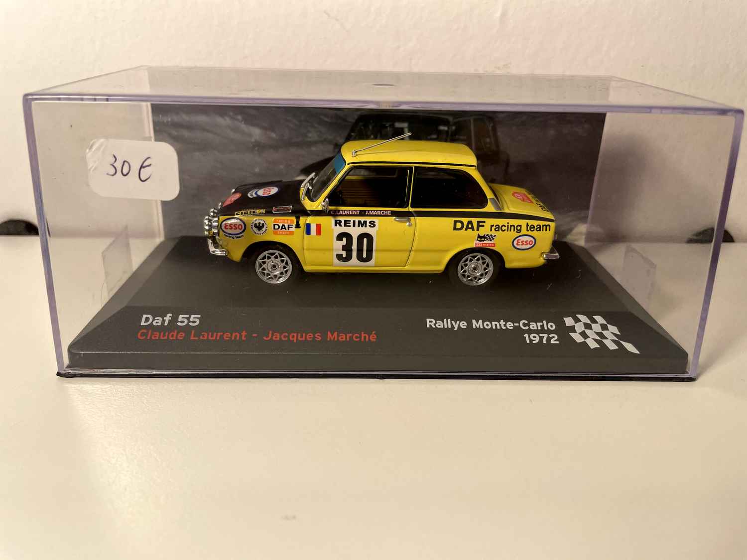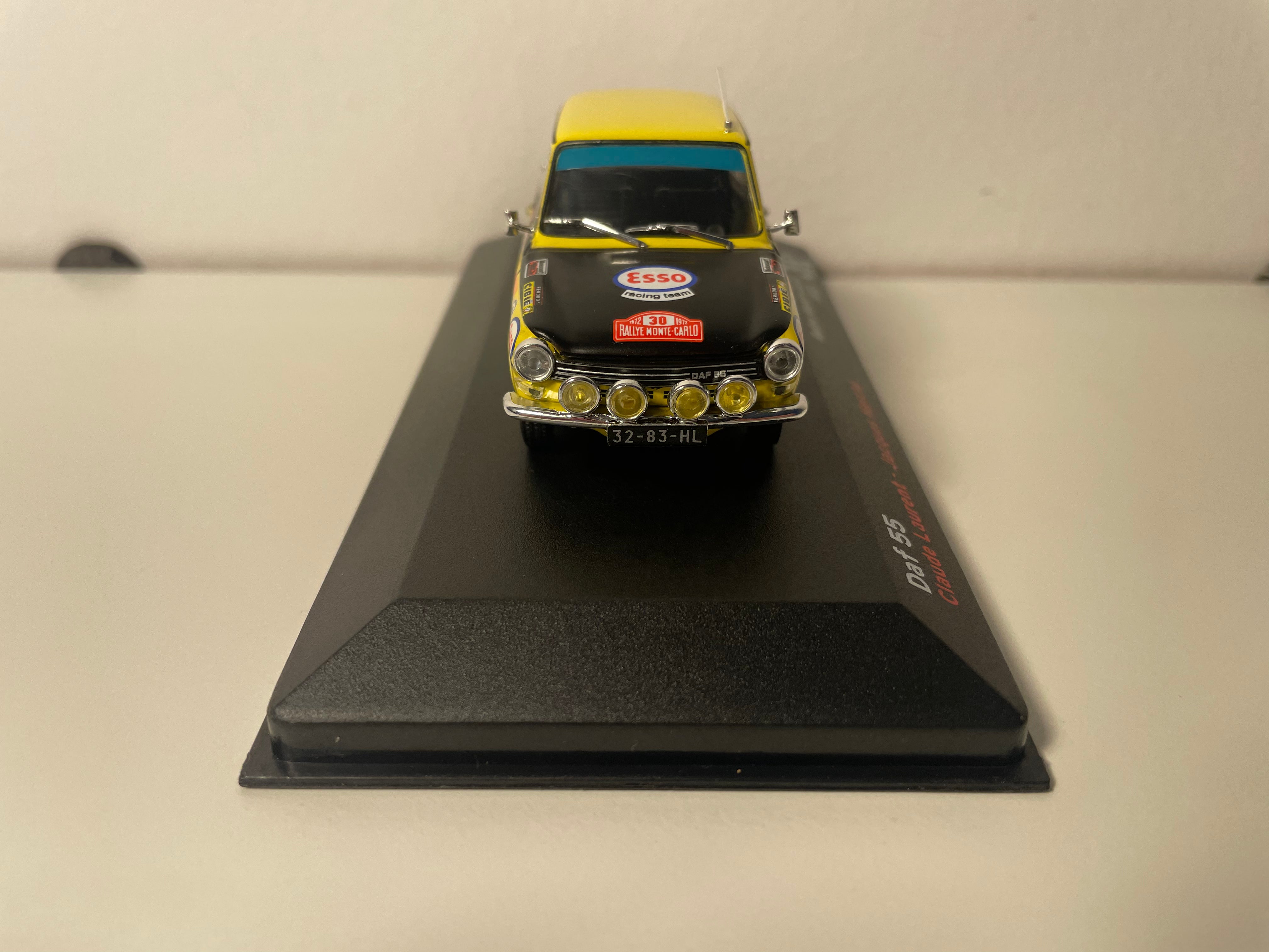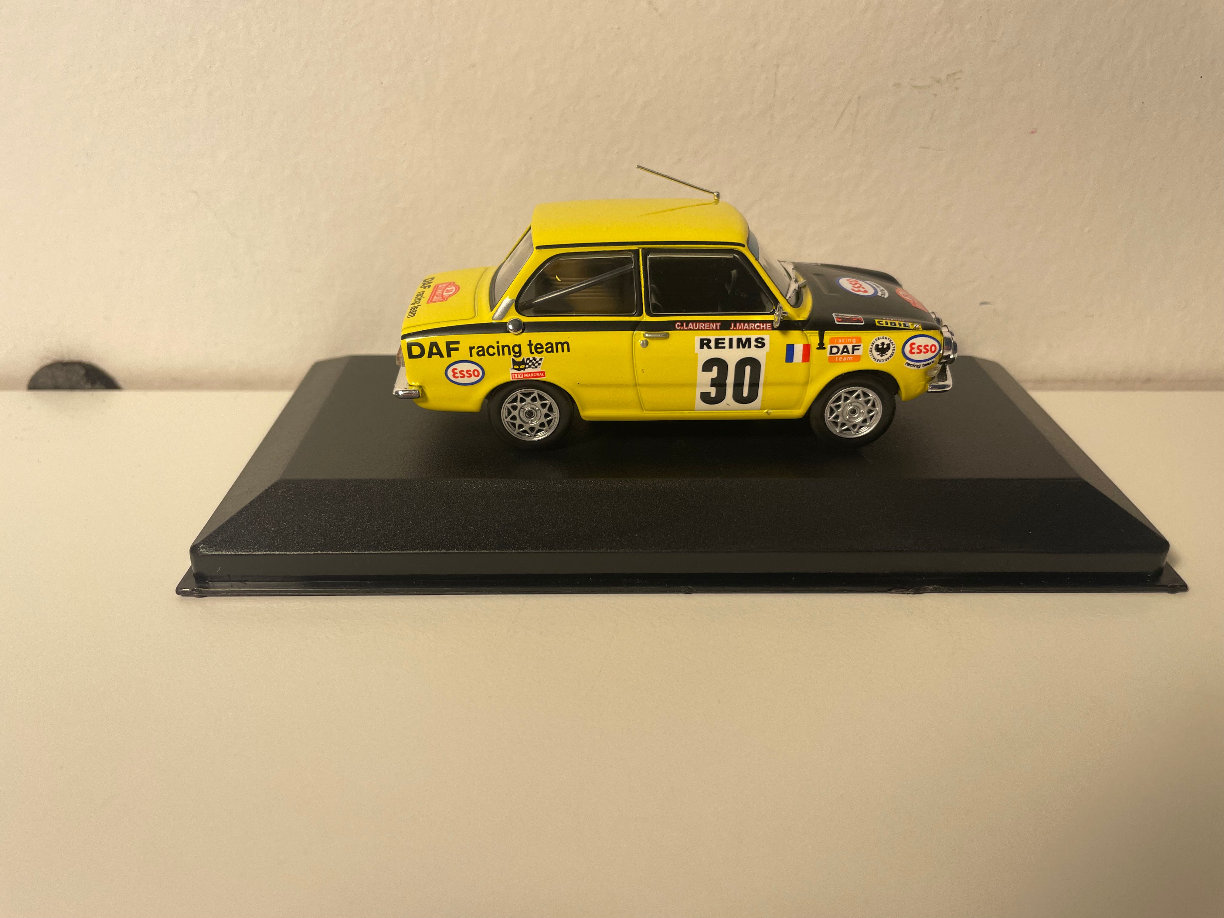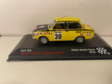 Dis Miniatur Daf 55 an de Faarwen giel an schwaarz reproduzéiert d'auto Nummer 30, déi um legendäre Monte-Carlo Rallye 1972 deelgeholl huet, gefuer vun Claude Laurent an Jacques Marché. Dëst Modell gefaangen den kämpfereschen Geescht vun dësem hollänneschen Sedan, deen et gewagt huet, europäesch Referenzen op de gewundene Stroossen vum Furstentum erauszufuerderen.