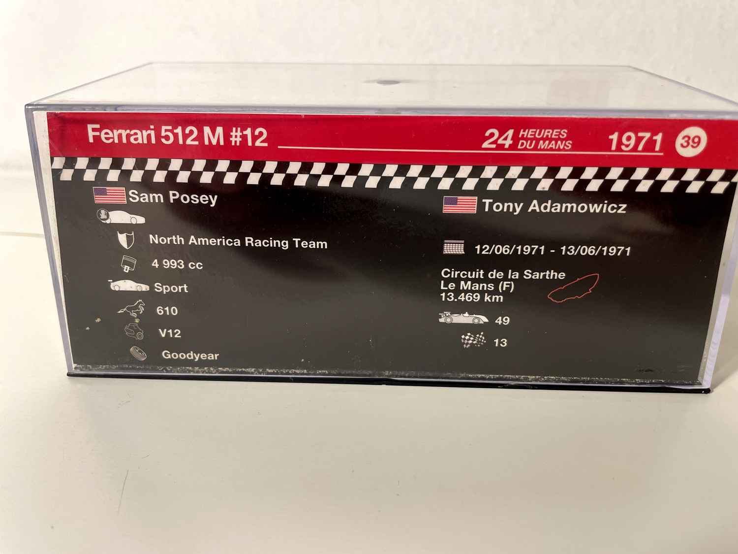 Däis Ferrari 512M rout Nummer 12 reproduzéiert getreu den Rennauto, deen d'24 Stonnen vum Mans 1971 markéiert huet. Gefuer vum amerikanesche Duo Sam Posey an Tony Adamowicz, representéiert dës Berlinette d'Giel Ära vum Endurance Auto-Rennsport, wann Ferrari nach ëmmer d'Zesummenheite mat senge legendäриche Prototypen dominéiert huet.