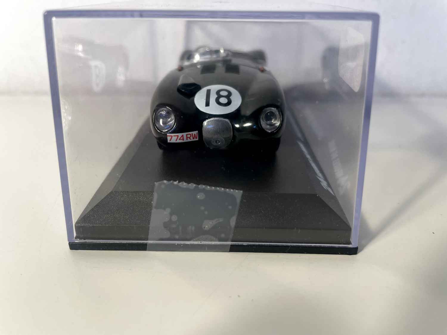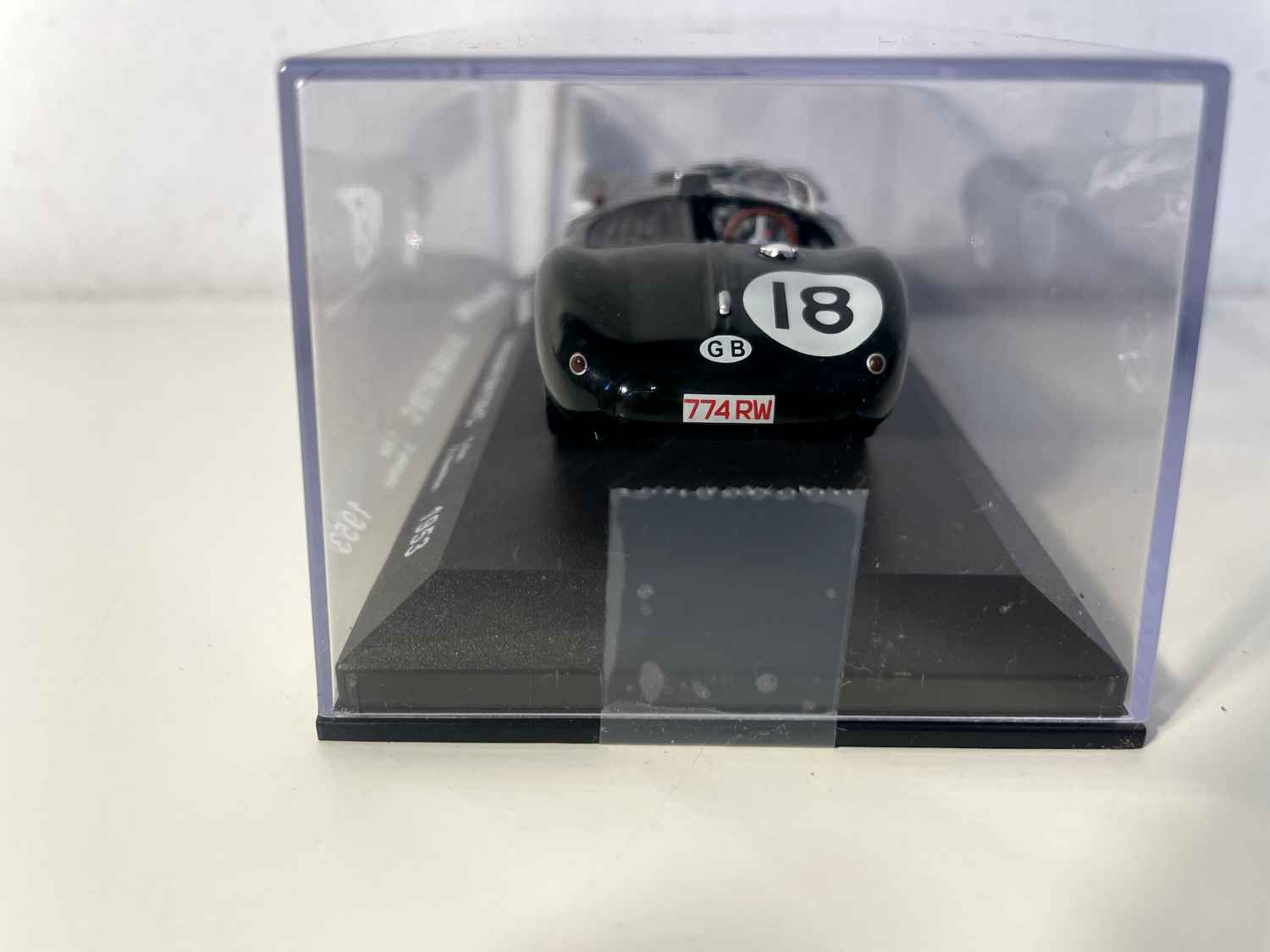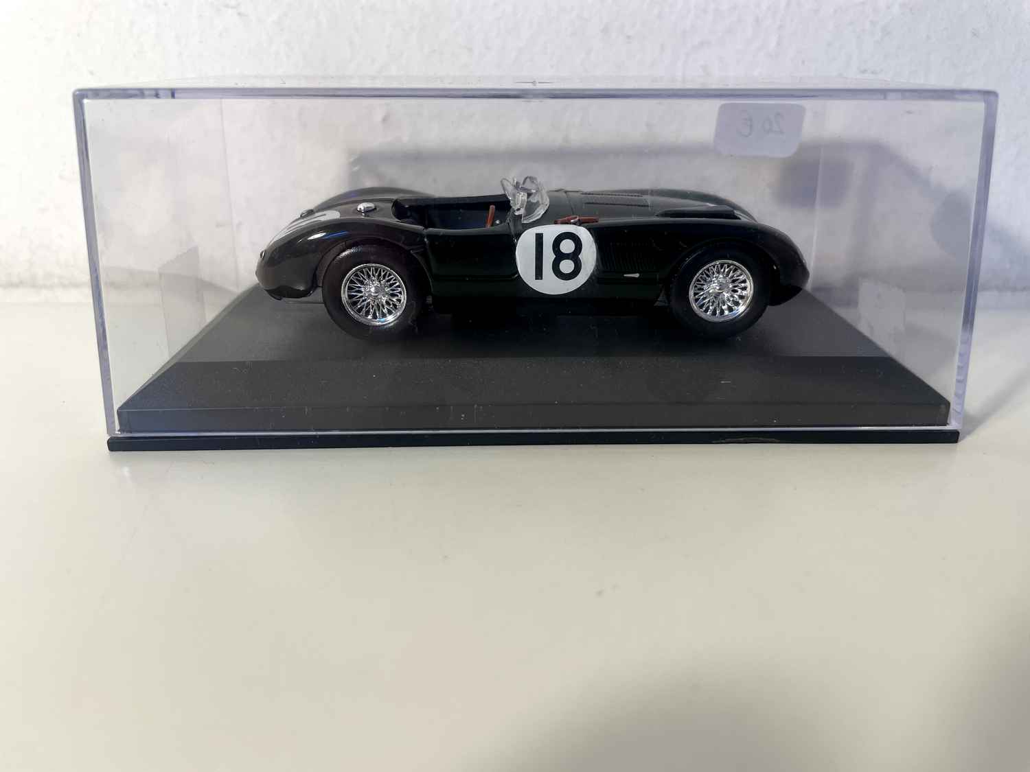 Dës donkelgréng Jaguar XK120C Nummer 18 reproduzéiert trei ee vun de kultigsten Autoen vun den 24 Stonnen vu Le Mans vun 1953. Gefuer vum Duo Tony Rolt an Duncan Hamilton fängt dës Miniatur d'Essenz vum gëllene Zäitalter vum briteschen Ausdauerrennen an. Nieft senger ästhetescher Schéinheet stellt dëst Stéck e richtegt Sammlerstéck duer, dat souwuel Autobegeeschterten ewéi och Liebhaber vun der Motorsportgeschicht usprieche wäert.