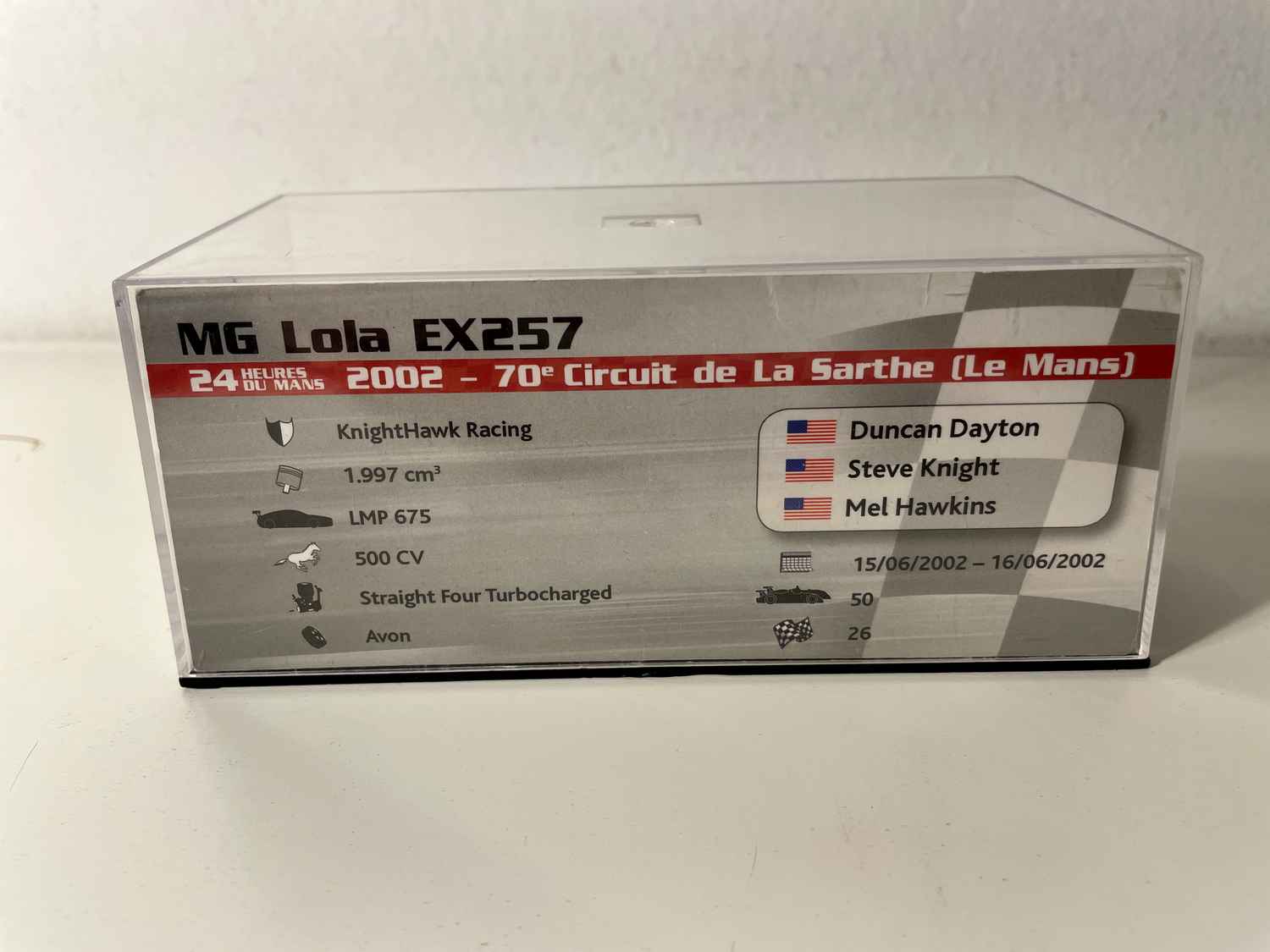 De MG Lola EX257 ass d'Resultat vun enger aussergewéinlecher Zesummenaarbecht tëscht der britescher Mark MG an der Chassisbauer Lola Cars. Speziell fir d'24 Stonne vum Le Mans entwéckelt, repräsentéiert dës LMP675 d'sportlech Wiedergeburt vu MG an de fréien 2000er.