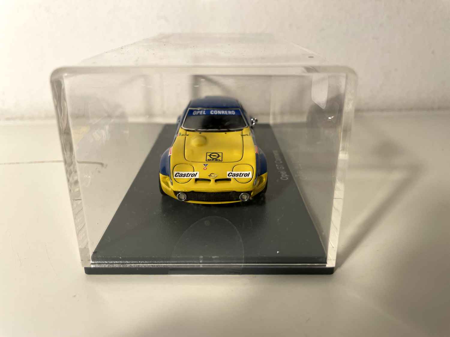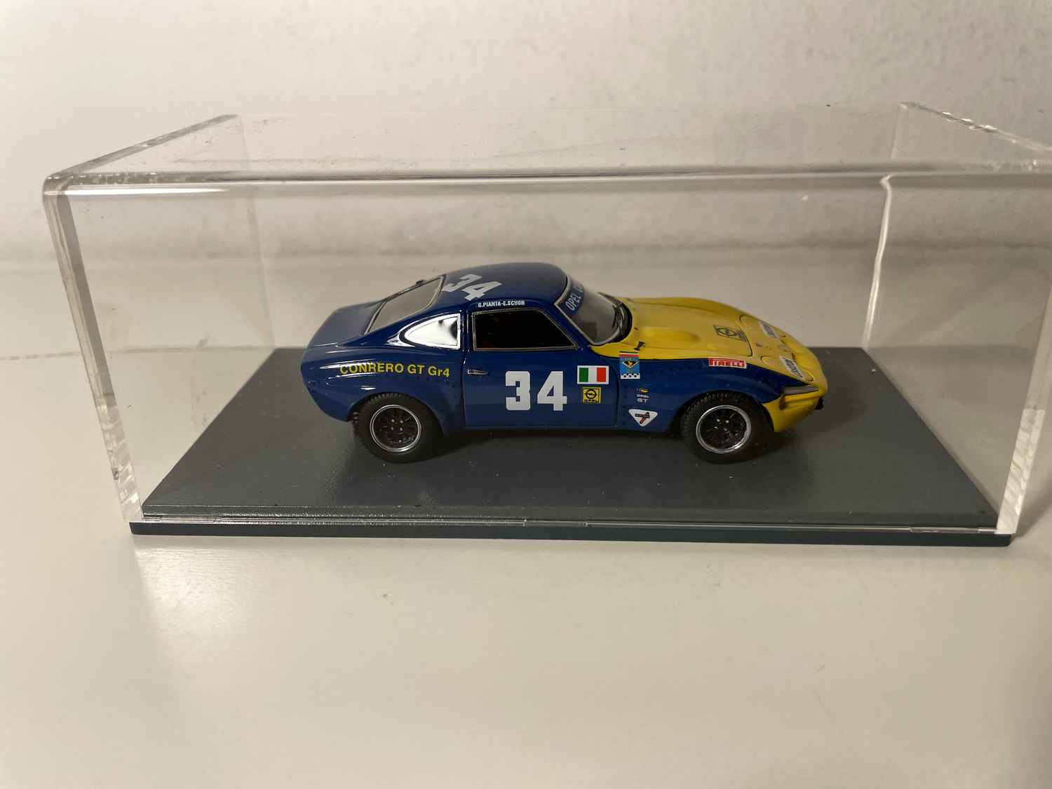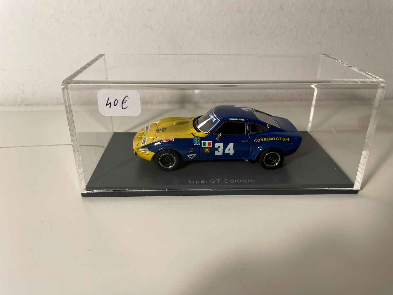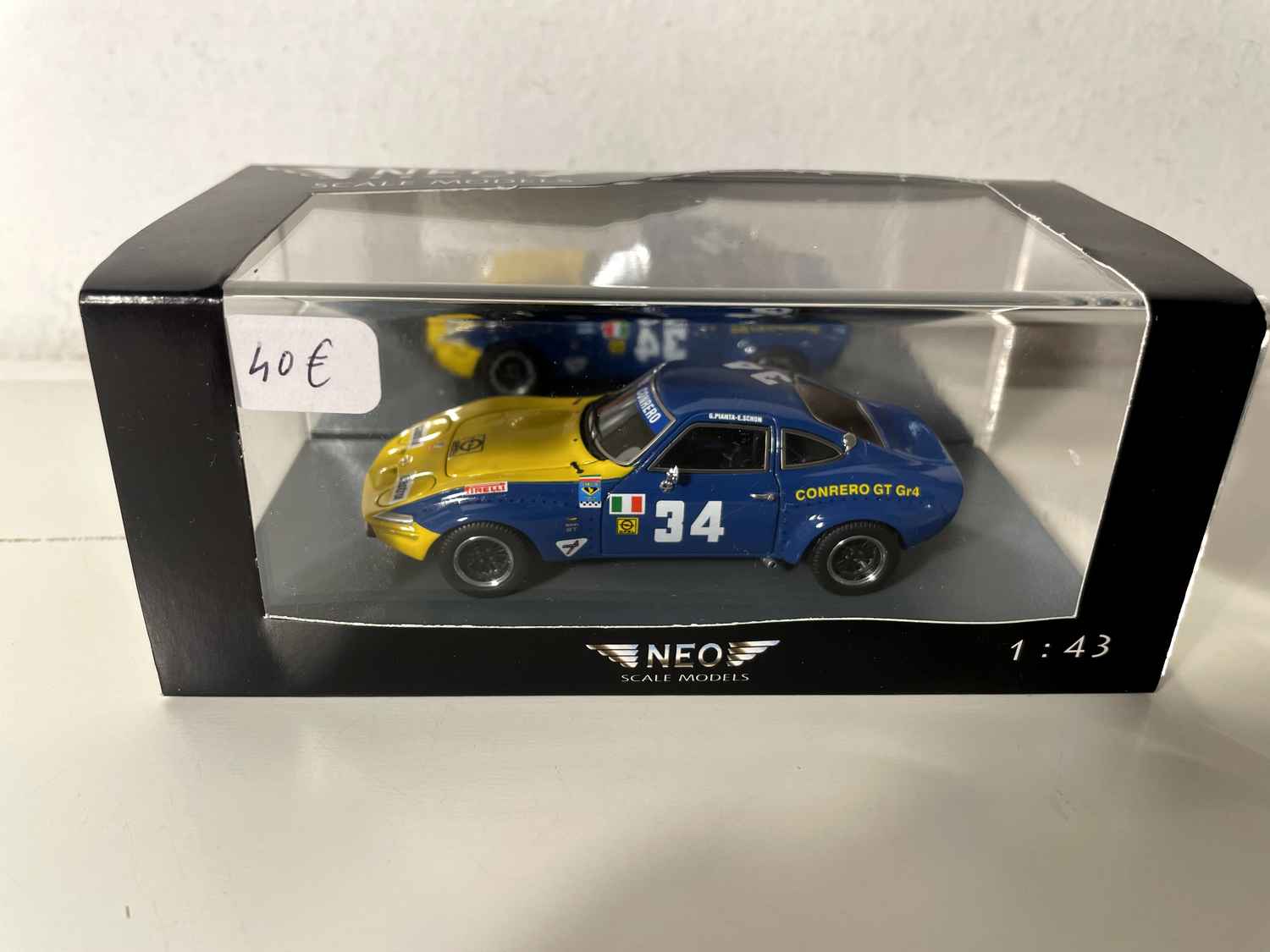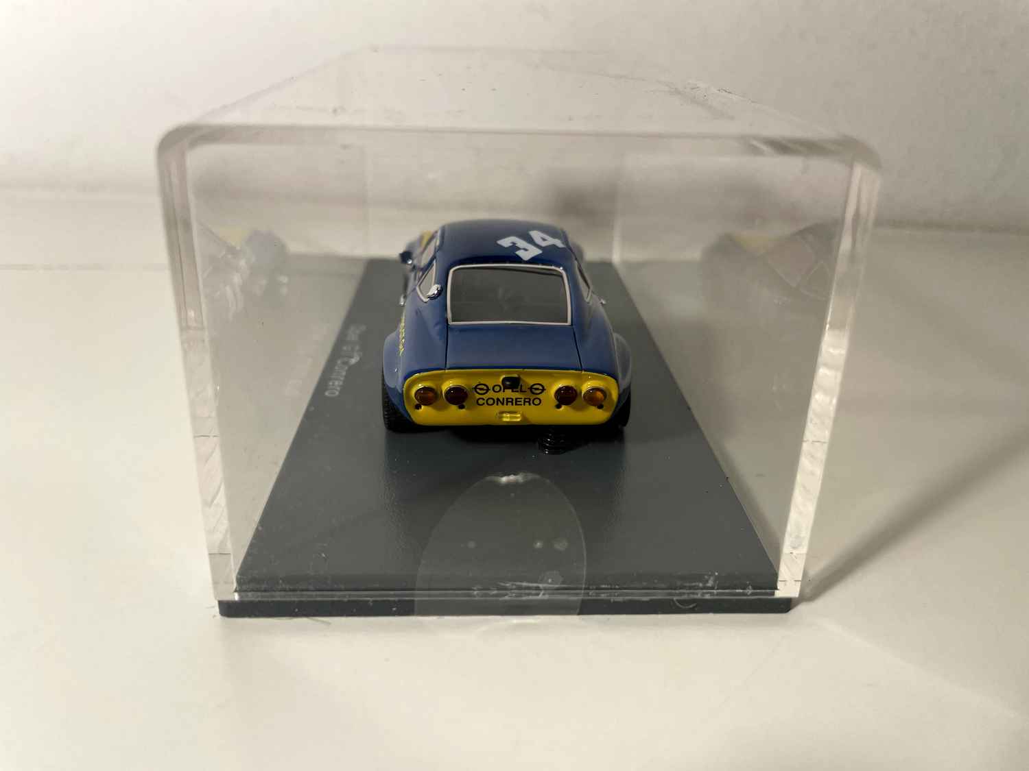 Den Opel GT Conrero blau a giel Nummer 34 vun NEO Scale Models stellt eng vun de meescht emblematesche Versiounen vun dësem klengen däitschen Coupe an der Rennkonfiguratioun duer. Dëse Modell erfaasst perfekt den sportleche Geescht vun den 1970er Joer, wann Conrero d'GT fir déi europäesch Circuiter ëmgewandelt huet.