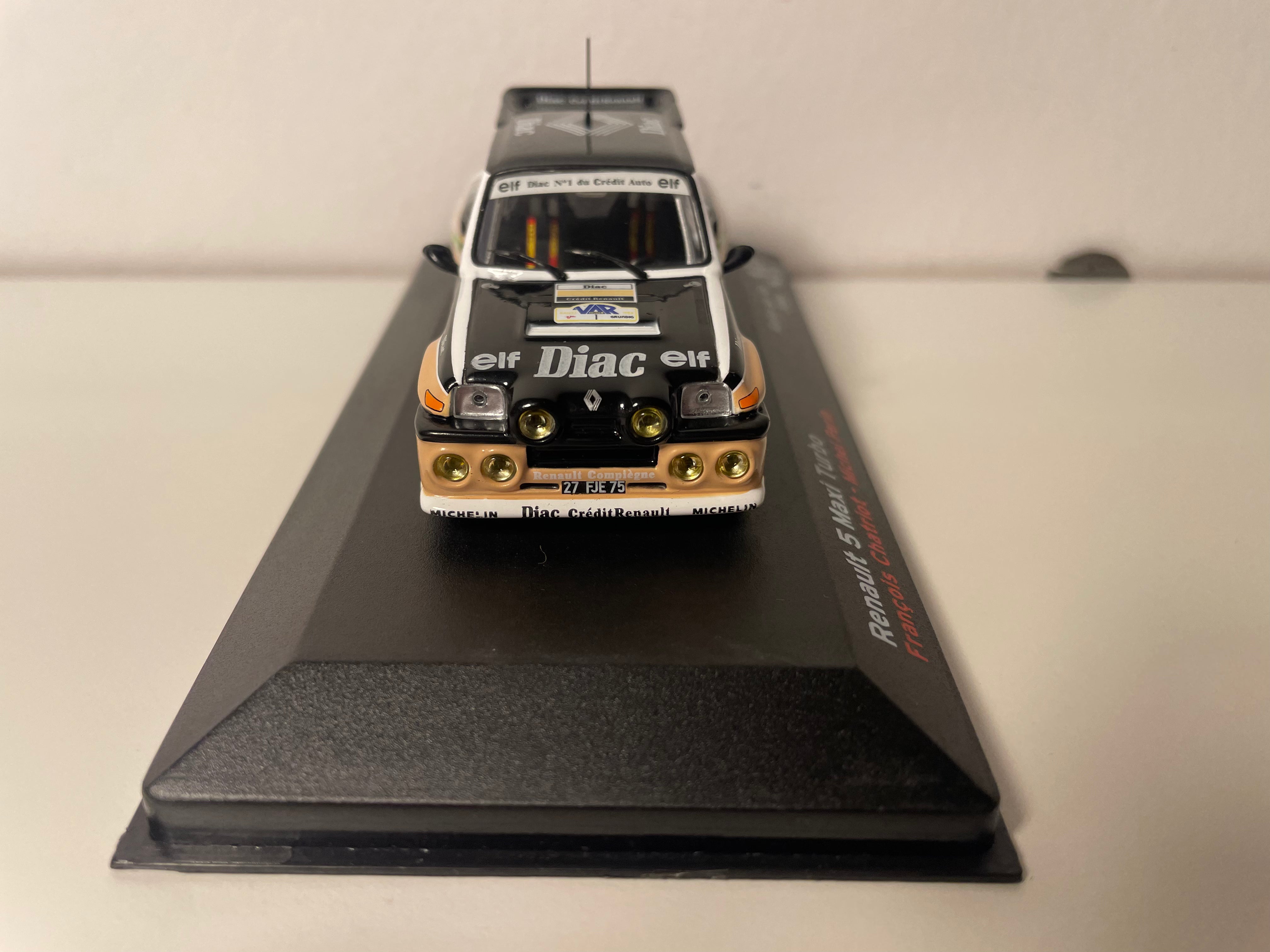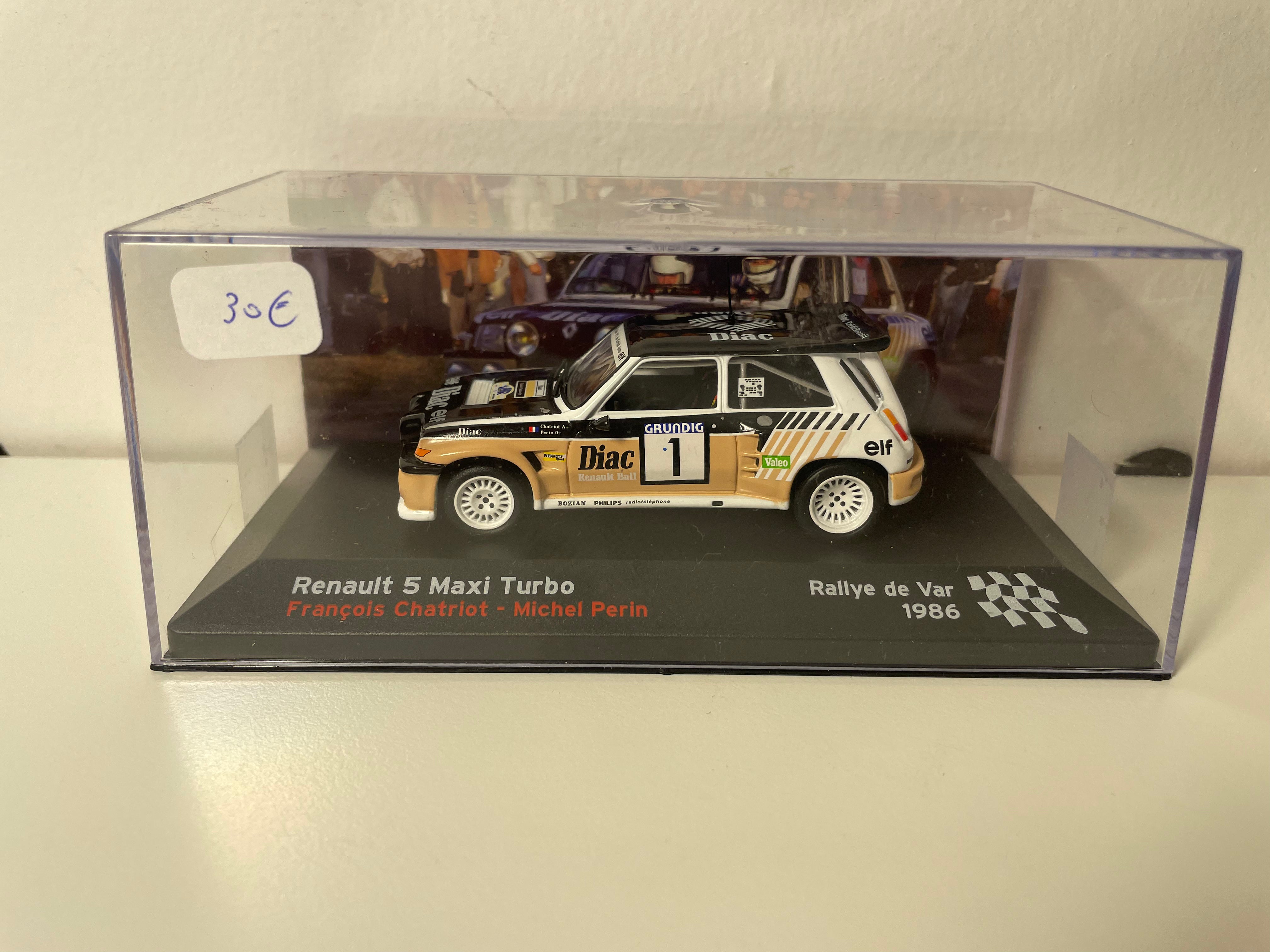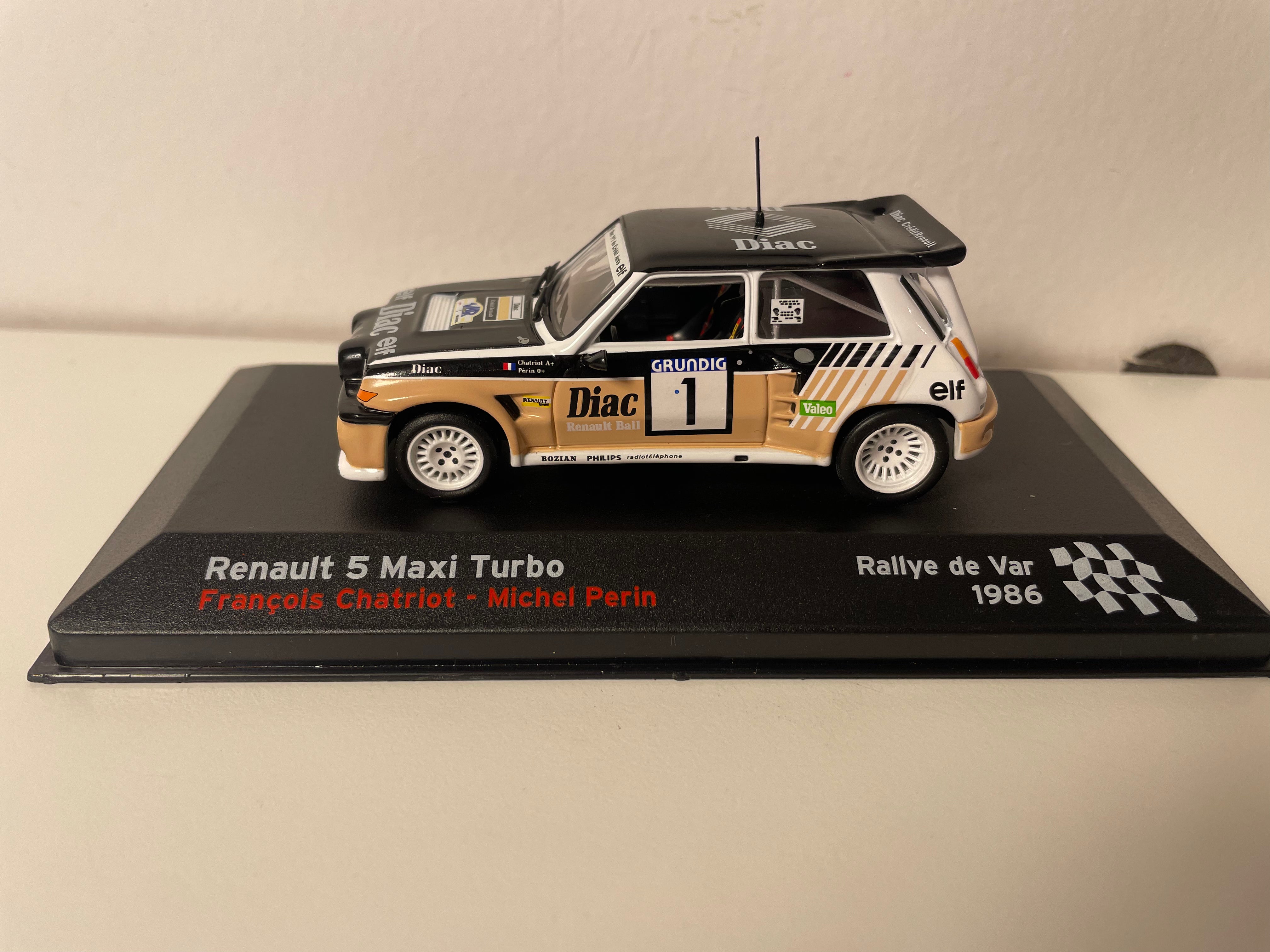 Dësen Renault 5 Maxi Turbo Nummer 1 stellt eng gerecht Stëmmung vun engem vun de spektakulärsten Boliden aus dem franséische Rallye aus den 1980er Joren. Mat senger tricolore Faarf schwaarz, brong a wäiss, dokumentéiert dës Miniatur am 1/43 Format d'Participatioun vum François Chatriot a Michel Perin um Rallye vum Var 1986, eng mythisch Etapp vum Championnat vun Frankräich.