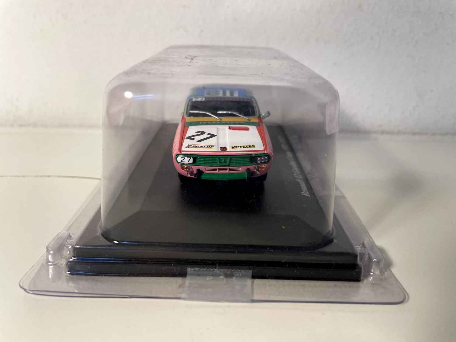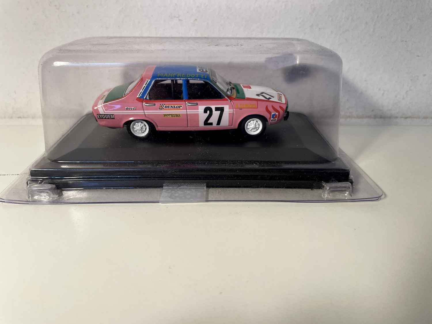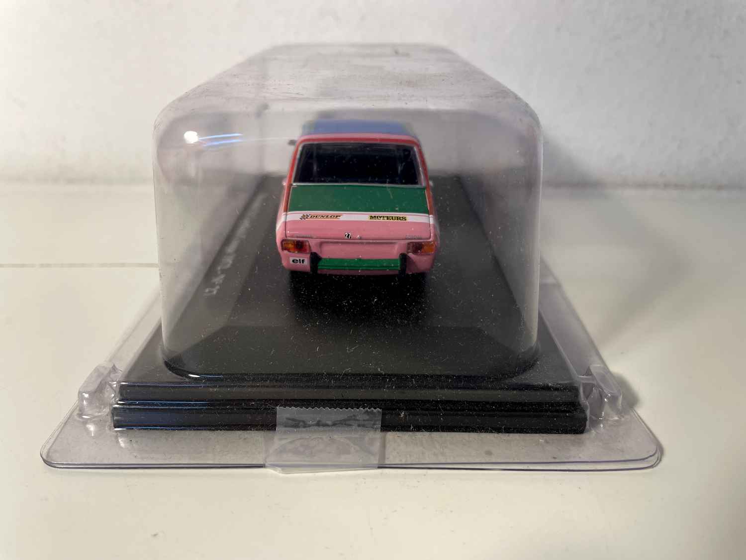 Découvrez cette magnifique miniature de la Renault 12 Gordini dans sa livrée de course distinctive rose, bleue, verte et blanche portant le numéro 27. Cette reproduction fidèle de l'édition Coupe 1972 capture parfaitement l'essence de cette sportive française emblématique qui marqua l'histoire du sport automobile hexagonal.
