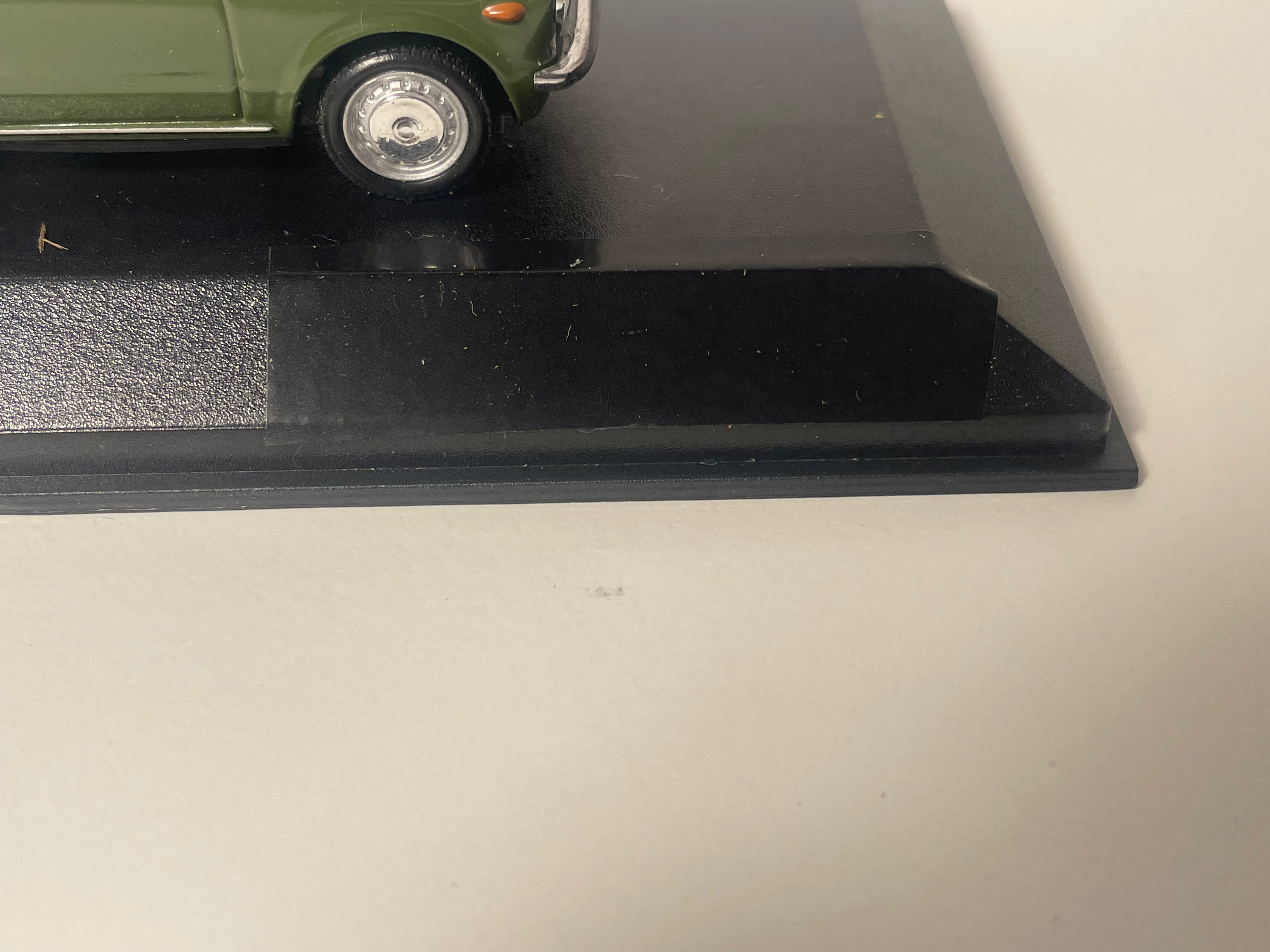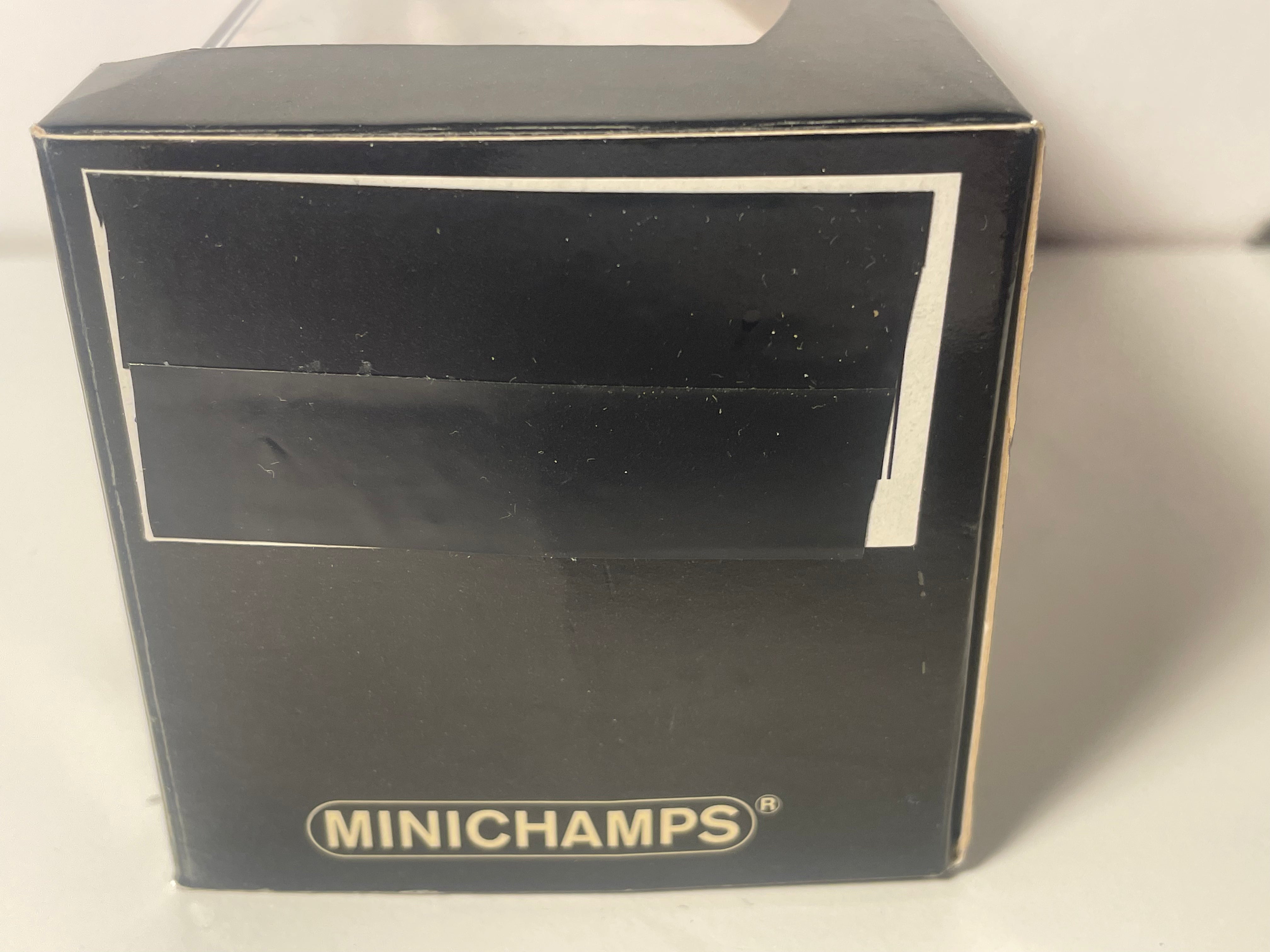 Le socle et la boite en carton sont bien de la marque Minichamps mais ne sont pas ceux de la voiture en elle même; ils ont été récupérés depuis une autre voiture Minichamps, de ce fait j'ai mis un scotch noir sur le socle et la boite afin de cacher le nom et la marque de la voiture qui à l'origine était sur ce socle