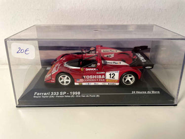 Cette Ferrari 333 SP rouge numéro 12 reproduit fidèlement la voiture de course qui a marqué l'édition 1998 des légendaires 24 Heures du Mans. Pilotée par le trio W. Taylor, F. Velez et E. Van De Poele, cette miniature capture l'essence même de l'une des Ferrari de sport les plus emblématiques des années 90.