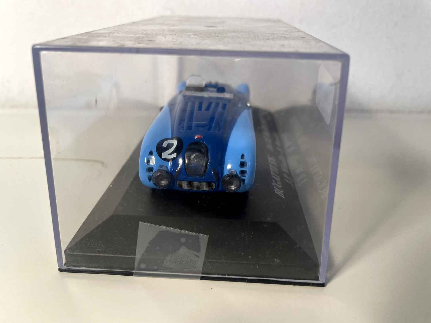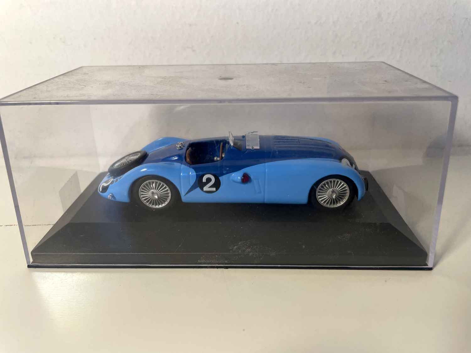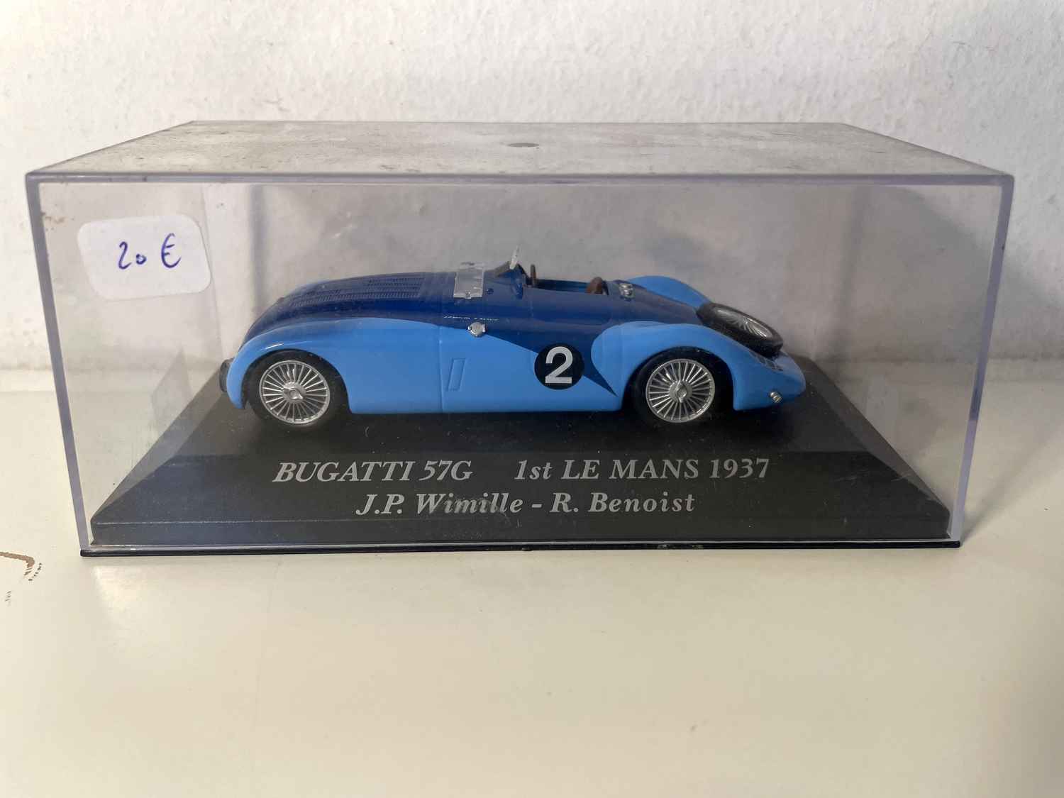 Voiture Miniature Bugatti 57G bleue et bleue numéro 2 - 24 heures du Mans de 1937 (grande boite plexi)