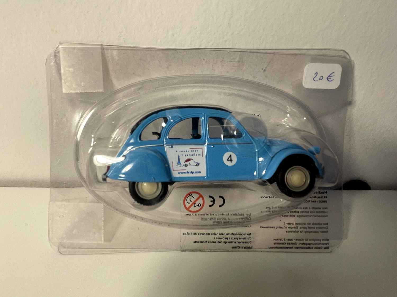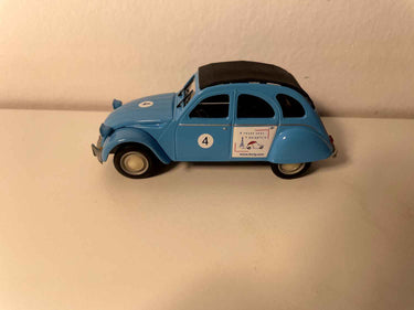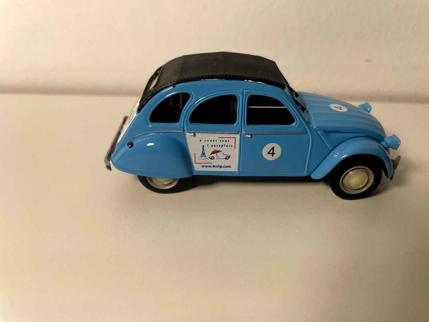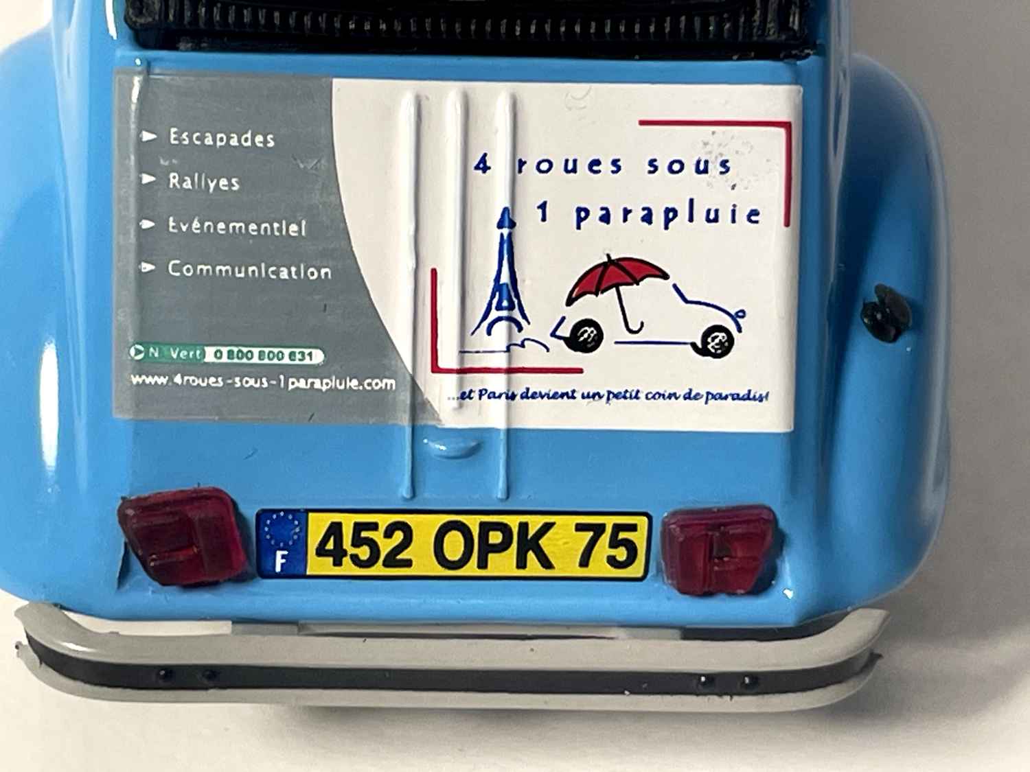 Voiture Miniature Citroën 2 CV 6 bleue et toit noir avec le numéro 4 et une publicité pour l'agence évènementielle "4 roues sous 1 parapluie" - Norev